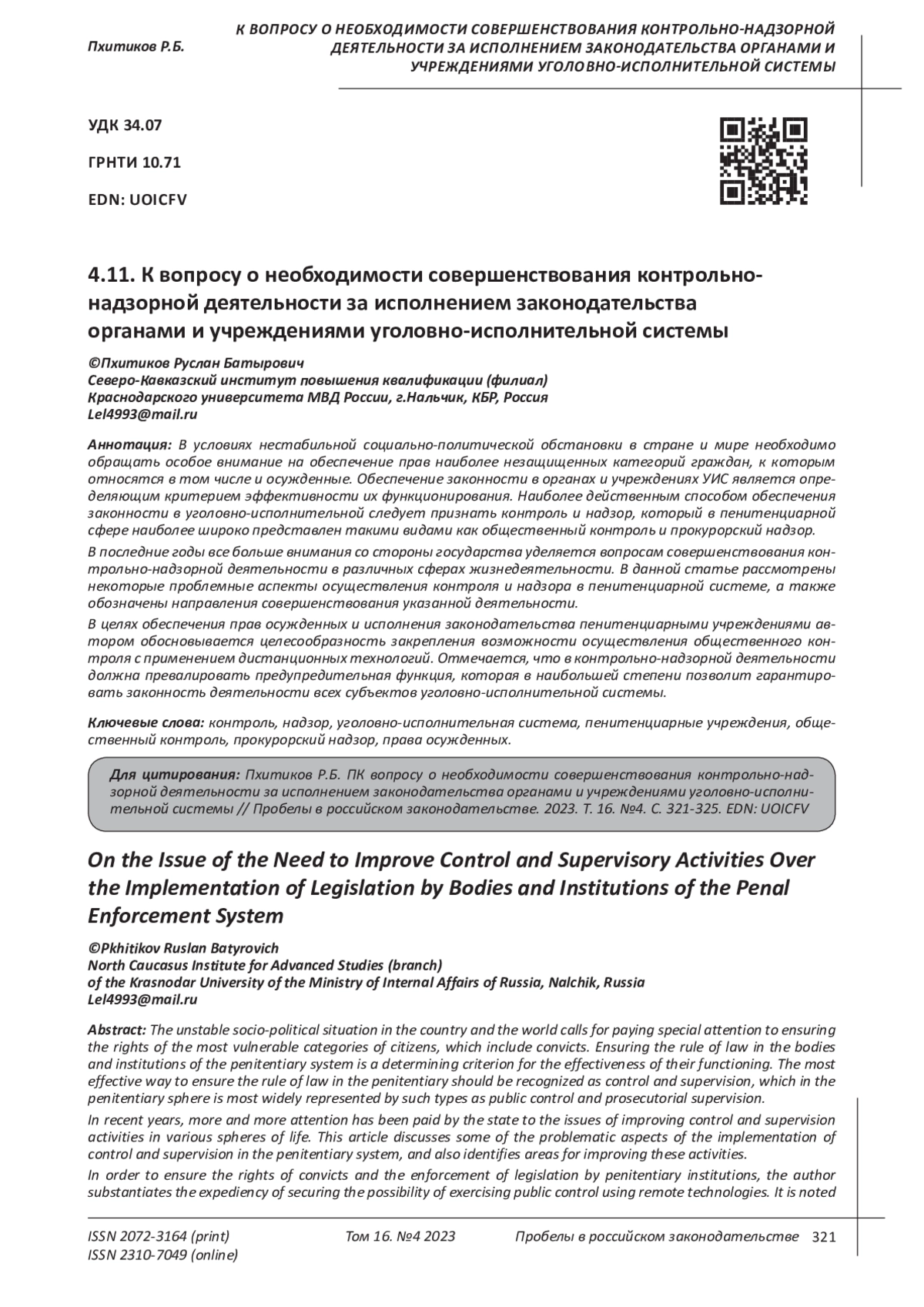 В условиях нестабильной социально-политической обстановки в стране и мире необходимо обращать особое внимание на обеспечение прав наиболее незащищенных категорий граждан, к которым относятся в том числе и осужденные. Обеспечение законности в органах и учреждениях УИС является определяющим критерием эффективности их функционирования. Наиболее действенным способом обеспечения законности в уголовно-исполнительной следует признать контроль и надзор, который в пенитенциарной сфере наиболее широко представлен такими видами как общественный контроль и прокурорский надзор. В последние годы все больше внимания со стороны государства уделяется вопросам совершенствования контрольно-надзорной деятельности в различных сферах жизнедеятельности. В данной статье рассмотрены некоторые проблемные аспекты осуществления контроля и надзора в пенитенциарной системе, а также обозначены направления совершенствования указанной деятельности. В целях обеспечения прав осужденных и исполнения законодательства пенитенциарными учреждениями автором обосновывается целесообразность закрепления возможности осуществления общественного контроля с применением дистанционных технологий. Отмечается, что в контрольно-надзорной деятельности должна превалировать предупредительная функция, которая в наибольшей степени позволит гарантировать законность деятельности всех субъектов уголовно-исполнительной системы.