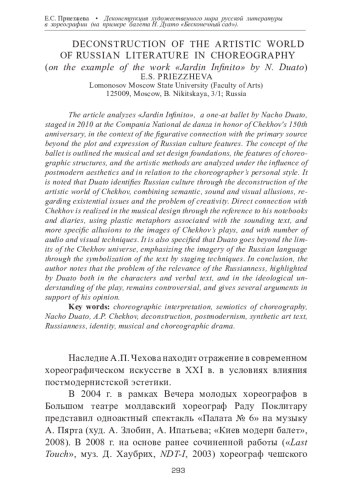 Наследие А. П. Чехова находит отражение в современном хореографическом искусстве в XXI в. в условиях влияния постмодернистской эстетики.