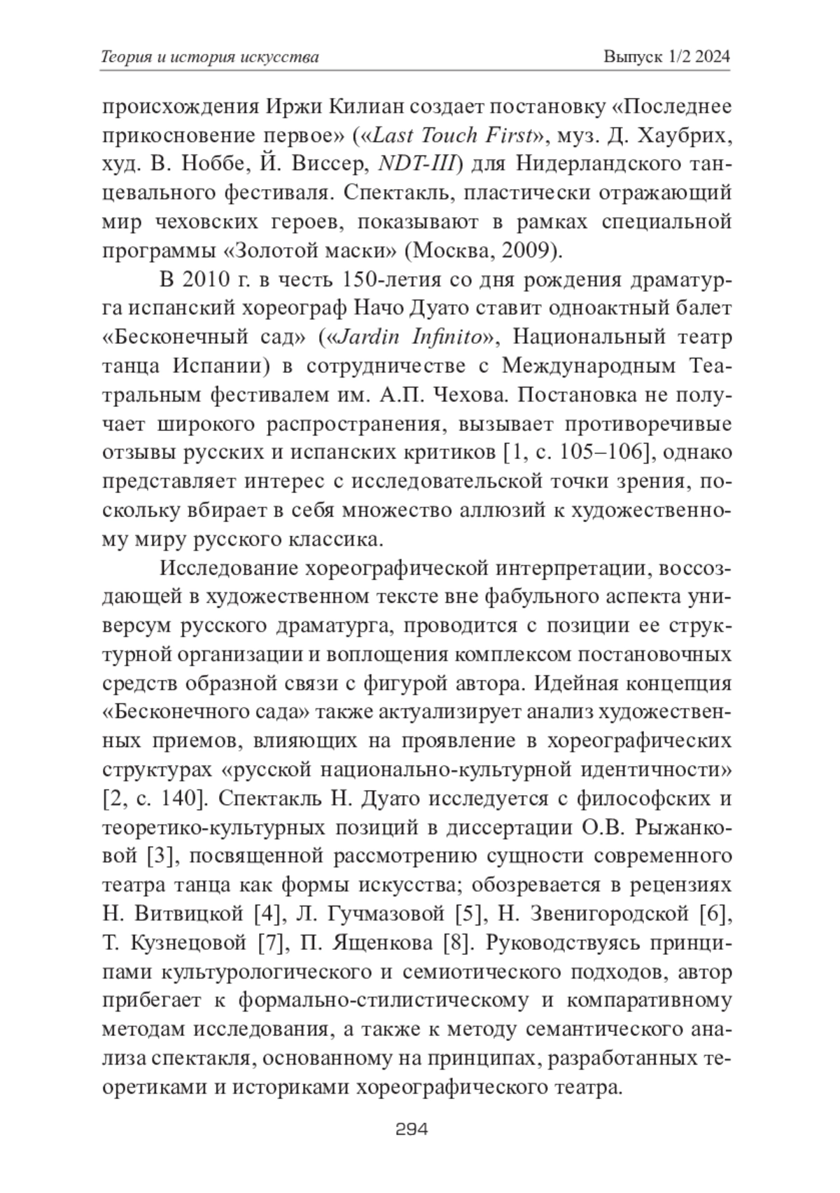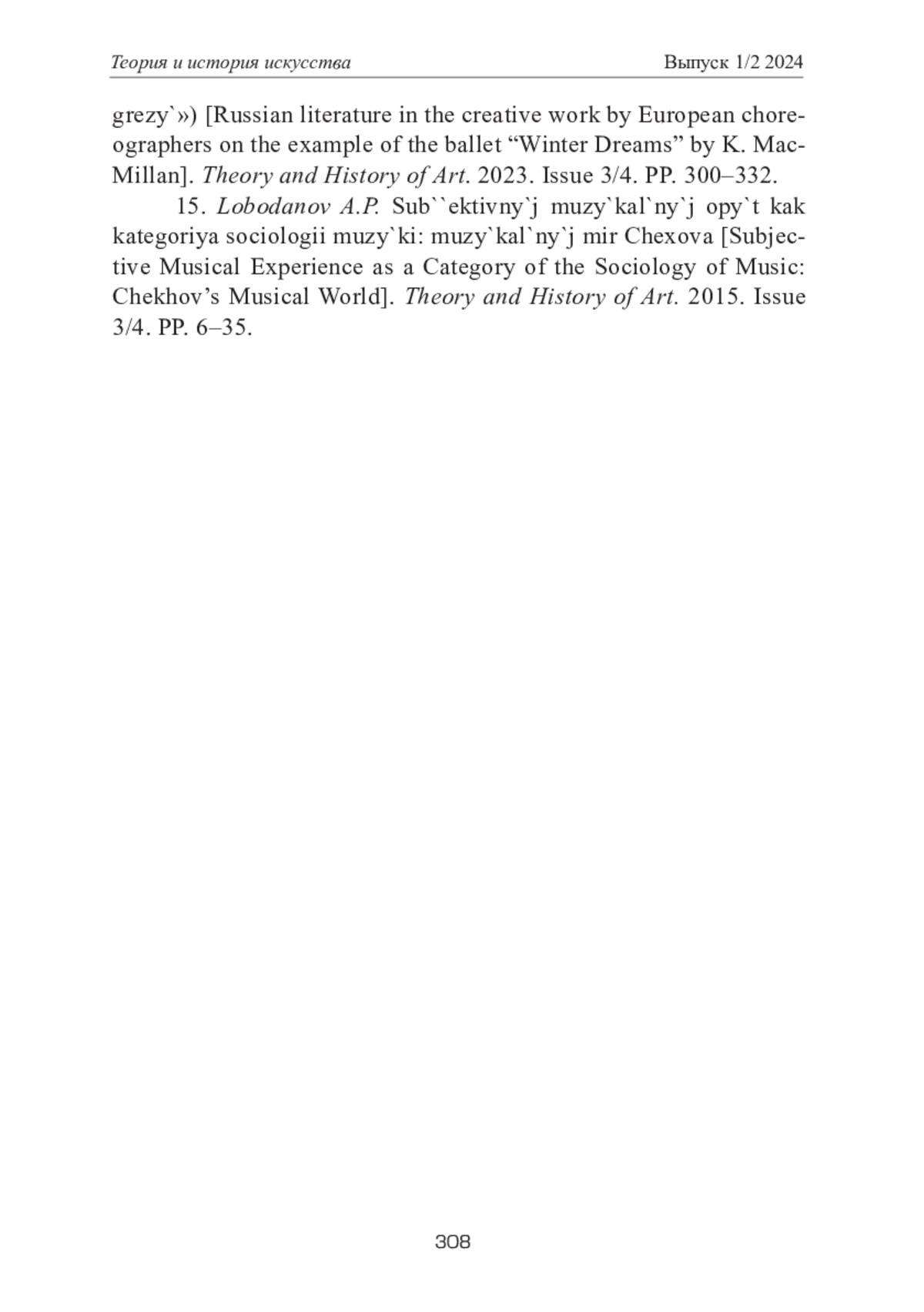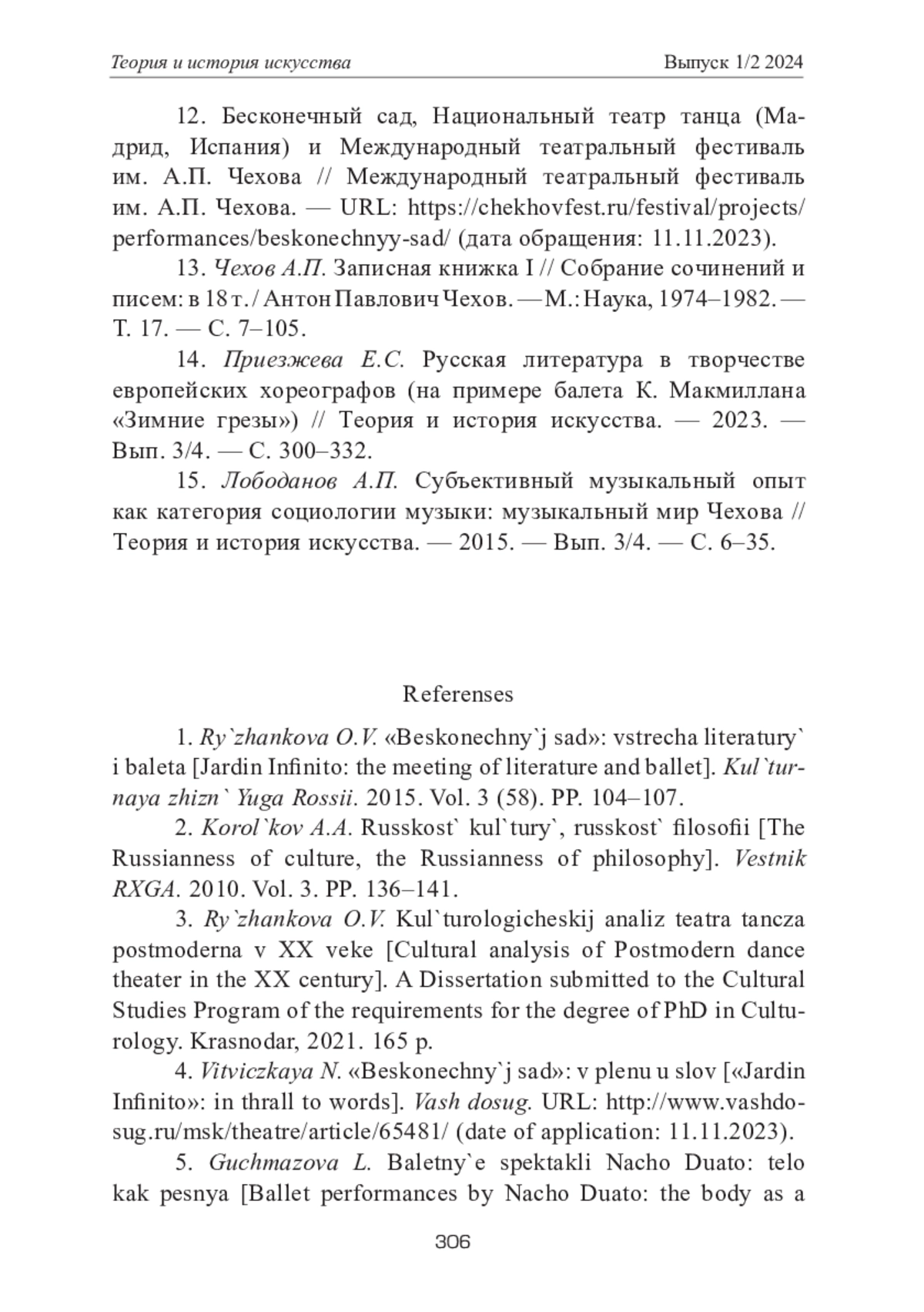 14. Приезжева Е.С. Русская литература в творчестве европейских хореографов (на примере балета К. Макмиллана “Зимние грезы”) // Теория и история искусства. - 2023. - Вып. 3/4. - С. 300-332. EDN: QZSWSV