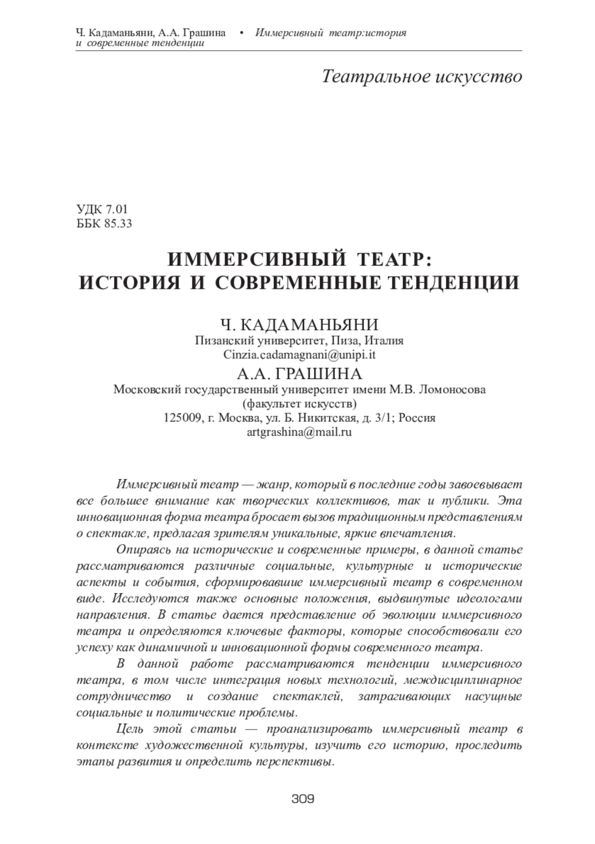 Иммерсивный театр — жанр, который в последние годы завоевывает все большее внимание как творческих коллективов, так и публики. Эта инновационная форма театра бросает вызов традиционным представлениям о спектакле, предлагая зрителям уникальные, яркие впечатления. Опираясь на исторические и современные примеры, в данной статье рассматриваются различные социальные, культурные и исторические аспекты и события, сформировавшие иммерсивный театр в современном виде. Исследуются также основные положения, выдвинутые идеологами направления. В статье дается представление об эволюции иммерсивного театра и определяются ключевые факторы, которые способствовали его успеху как динамичной и инновационной формы современного театра. В данной работе рассматриваются тенденции иммерсивного театра, в том числе интеграция новых технологий, междисциплинарное сотрудничество и создание спектаклей, затрагивающих насущные социальные и политические проблемы. Цель этой статьи — проанализировать иммерсивный театр в контексте художественной культуры, изучить его историю, проследить этапы развития и определить перспективы.