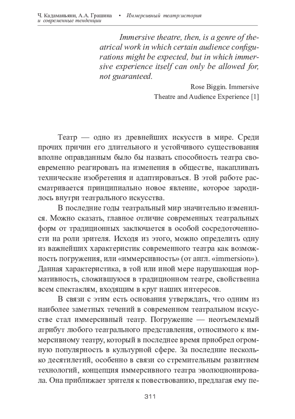 3. Alston A. Making mistakes in immersive theatre: Spectatorship and errant immersion // Journal of Contemporary Drama in English. - 2016. - Т. 4. - № 1. - С. 61-73.