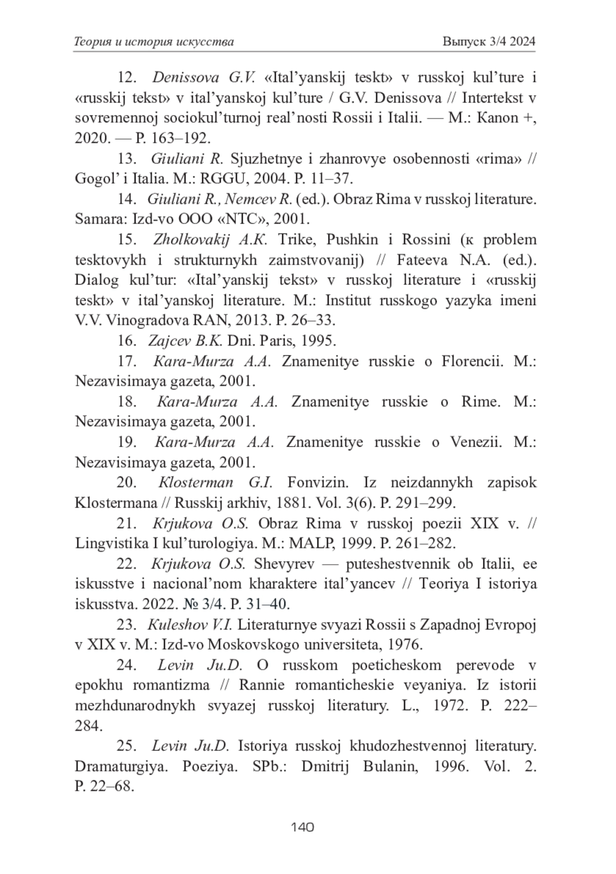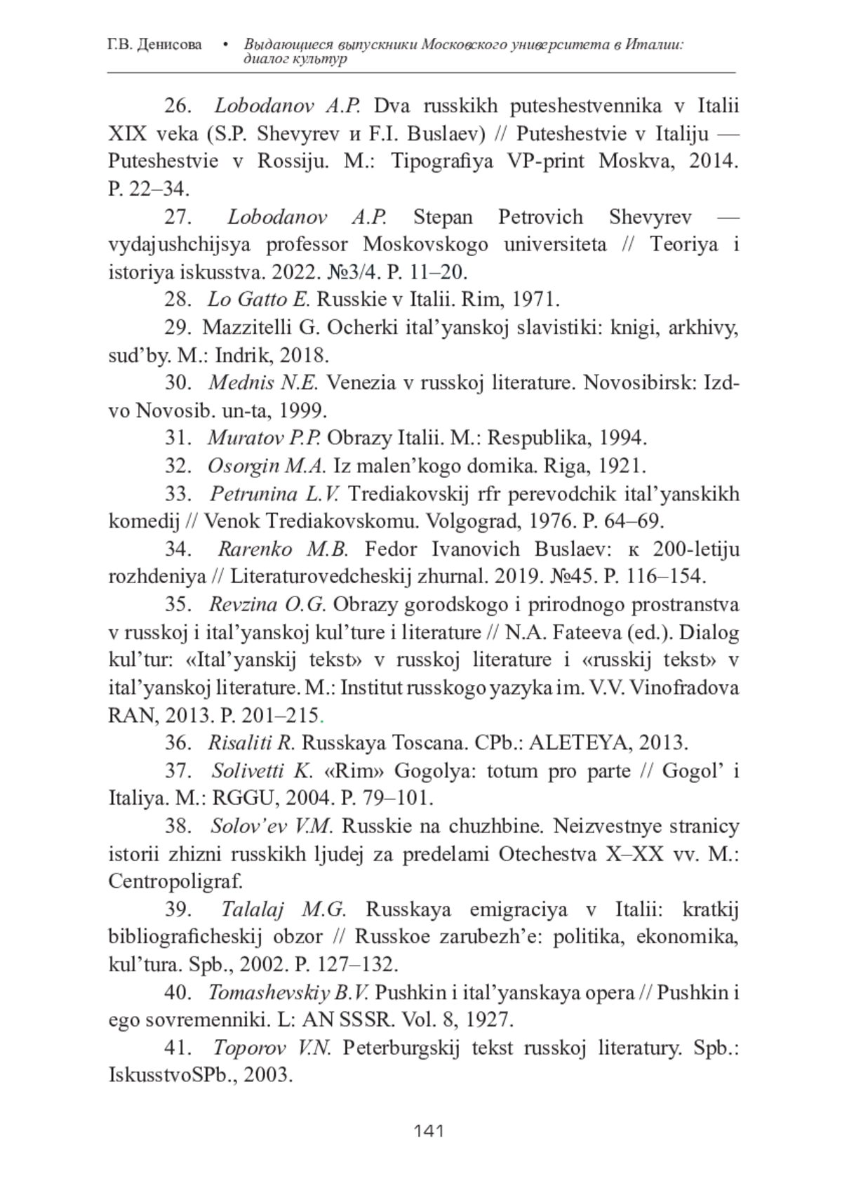 12. Денисова Г.В. “Итальянский текст” в русской культуре и “русский текст” в итальянской культуре / Г.В. Денисова // Интертекст в современной социокультурной реальности России и Италии. - М.: Канон +, 2020. - 163-192.