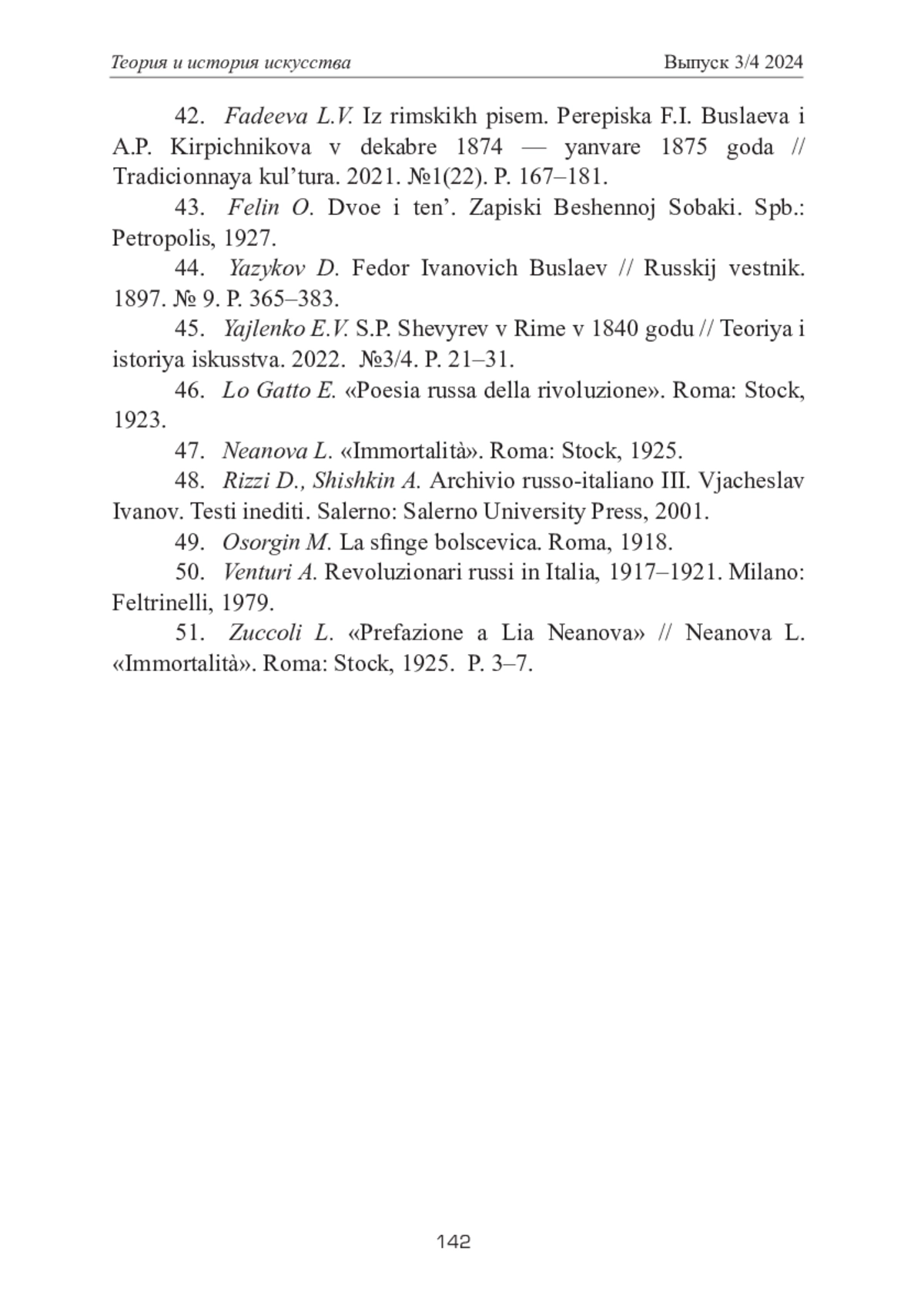 41. Фадеева Л.В. Из римских писем. Переписка Ф.И. Буслаева и А.И. Кирпичникова в декабре 1874 - январе 1875 года // Традиционная культура. - 2021. - №1(22). - С. 167-181. EDN: RRDSGV