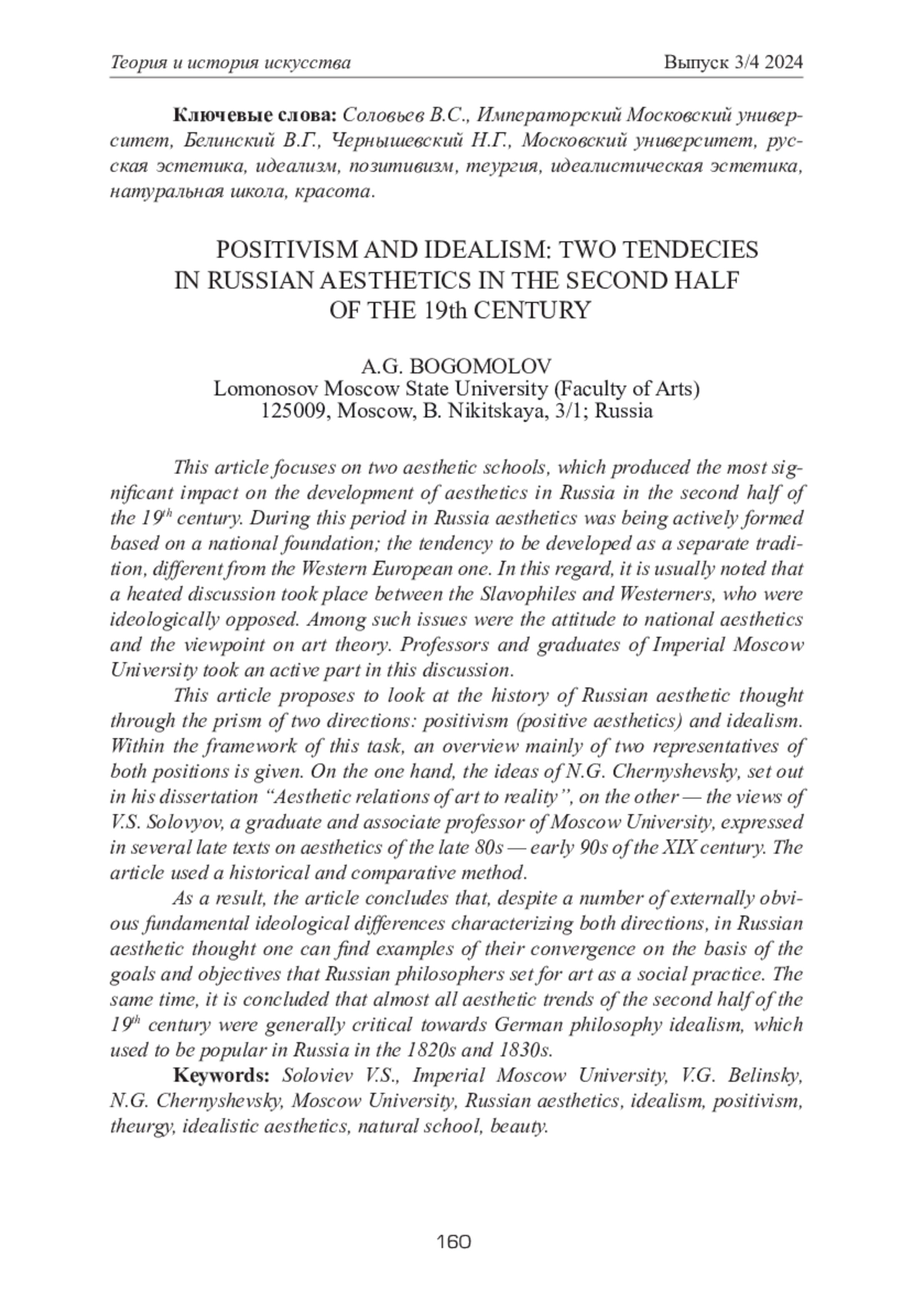 БОГОМОЛОВ А. Г. ПОЗИТИВИЗМ И ИДЕАЛИЗМ: ДВА НАПРАВЛЕНИЯ В РУССКОЙ ЭСТЕТИКЕ ВТОРОЙ ПОЛОВИНЫ XIX ВЕКА // ТЕОРИЯ И ИСТОРИЯ ИСКУССТВА. 2024. № 3-4