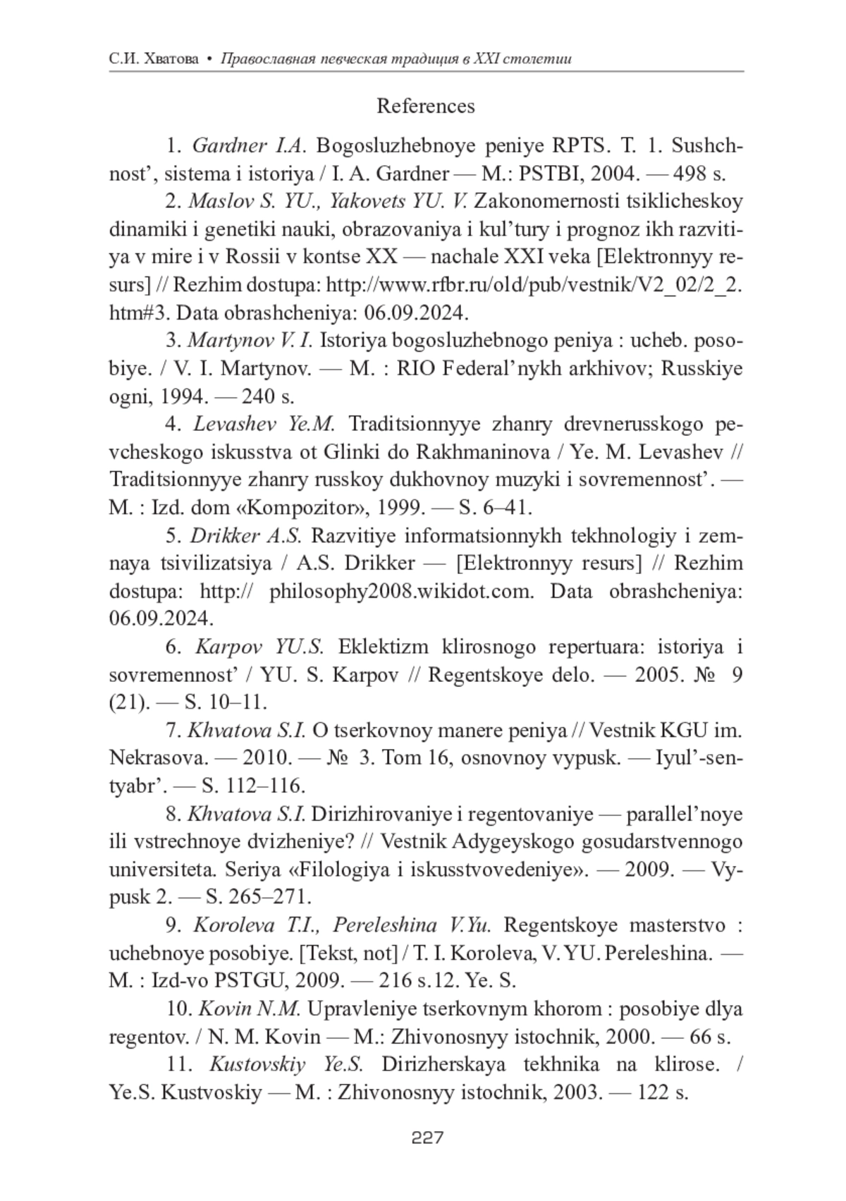 7. Хватова С.И. О церковной манере пения // Вестник КГУ им. Некрасова. - 2010. - № 3. Том 16, основной выпуск. - Июль-сентябрь. - С. 112-116. EDN: NDANKP