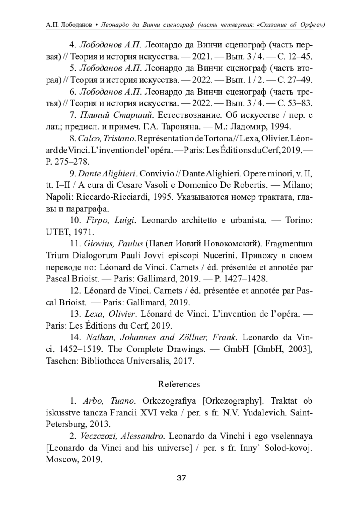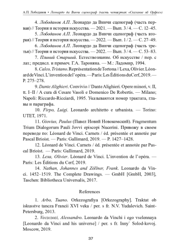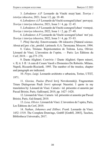 4. Лободанов А.П. Леонардо да Винчи сценограф (часть первая) // Теория и история искусства. - 2021. - Вып. 3 / 4. - С. 12-45. EDN: ZGXXXL