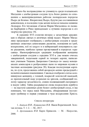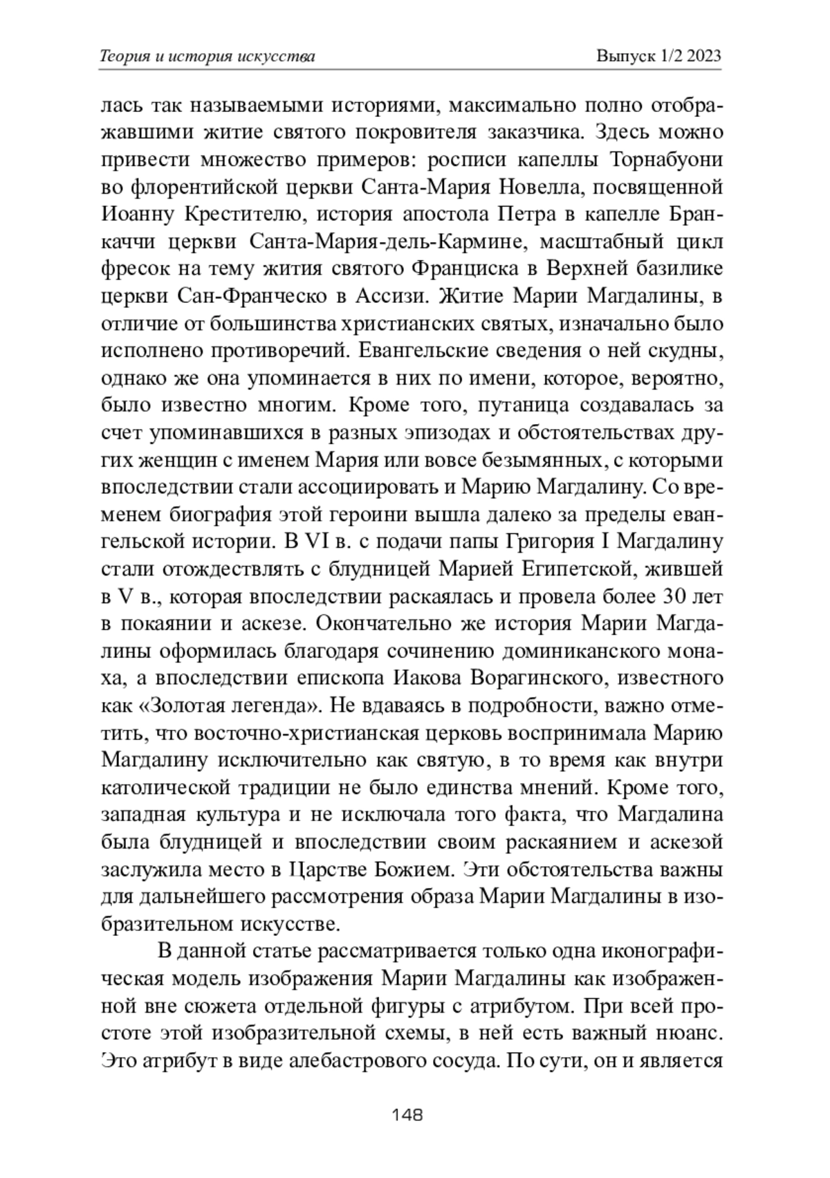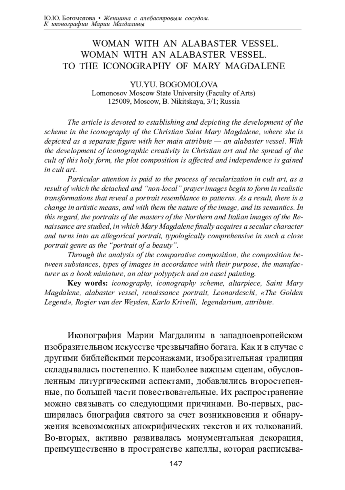 Статья посвящена сложению и развитию изобразительной схемы в иконографии христианской святой Марии Магдалины, где она изображается в виде обособленной фигуры со своим главным атрибутом — алебастровым сосудом. По мере развития иконографического творчества в христианском искусстве и распространения культа этой святой ее образ выделяется из сюжетной композиции и обретает самостоятельность в культовом искусстве. Особое внимание уделяется процессам обмирщения в культовом искусстве, в результате которых отстраненные и «нездешние» молельные образы начинают трансформироваться в реалистические изображения, обнаруживающие портретное сходство с моделями. Как следствие — происходит смена художественных средств, а с ними и характер изображения, и его семантика. В связи с этим детально рассматриваются портреты мастеров Северного и Итальянского Ренессанса, в которых образ Марии Магдалины окончательно обретает светский характер и превращается в аллегорический портрет, типологически интегрированный в такую разновидность портретного жанра, как «портрет красавицы». Посредством сопоставительного анализа устанавливается связь между разными типами изображений в соответствии с их назначением, такими как книжная миниатюра, алтарный полиптих и станковая картина.