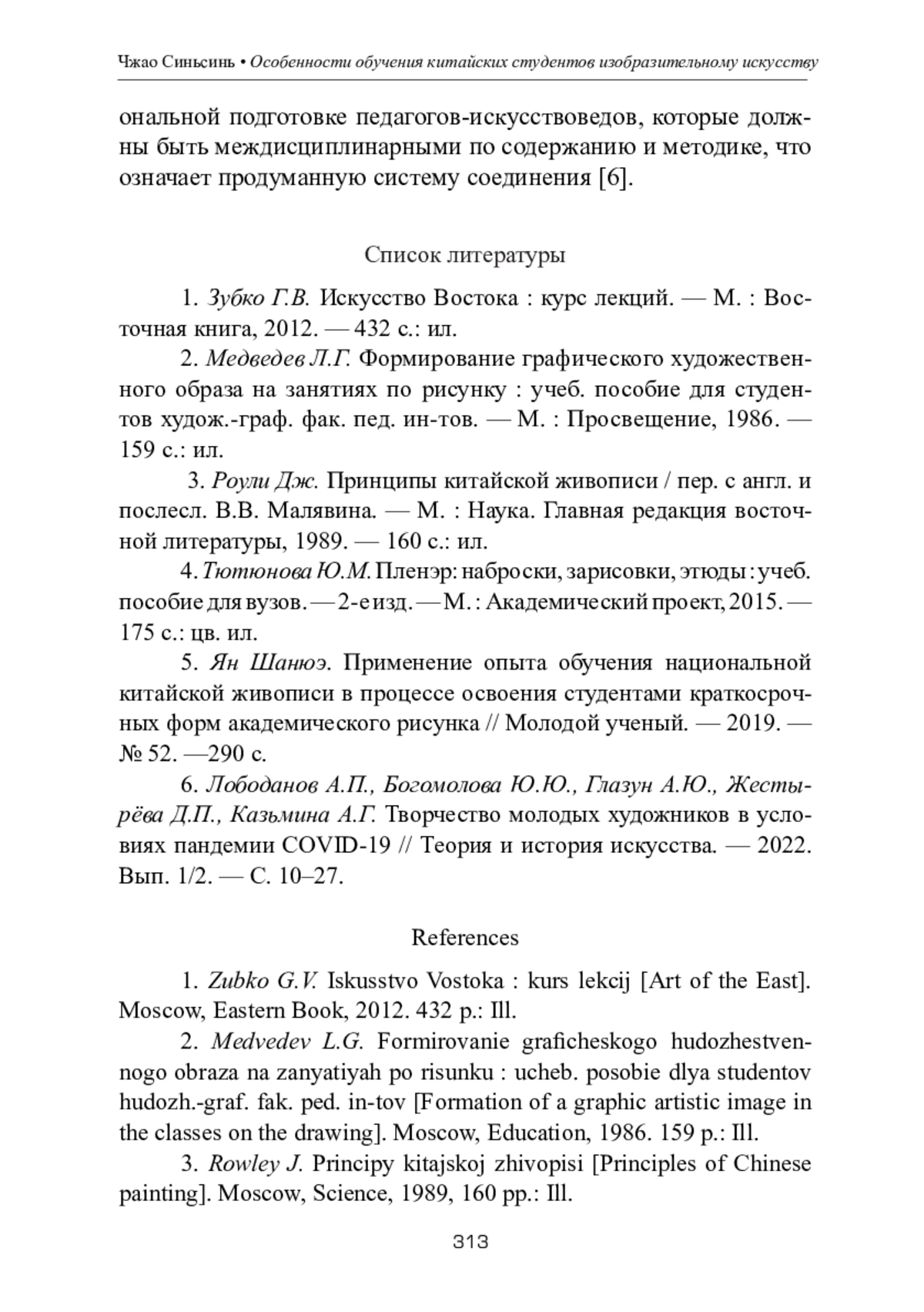 5. Ян Шанюэ. Применение опыта обучения национальной китайской живописи в процессе освоения студентами краткосрочных форм академического рисунка // Молодой ученый. - 2019. - № 52. -290 с.