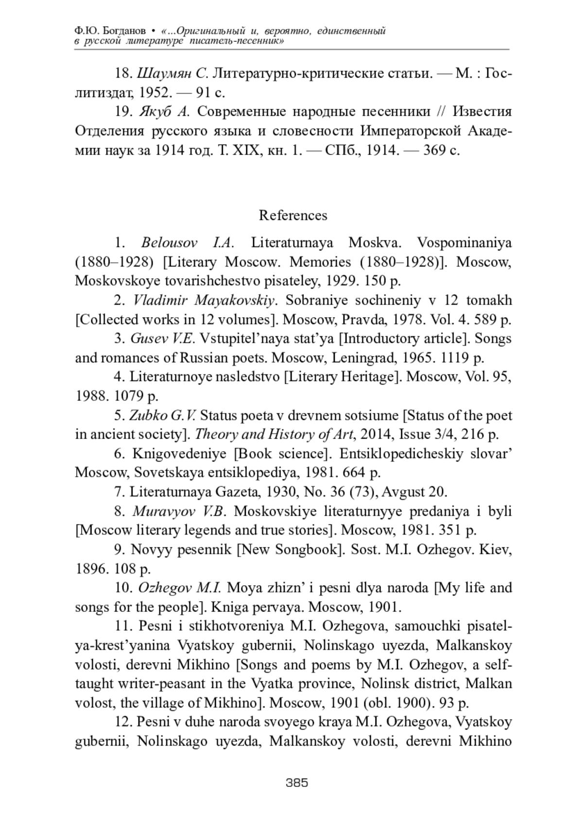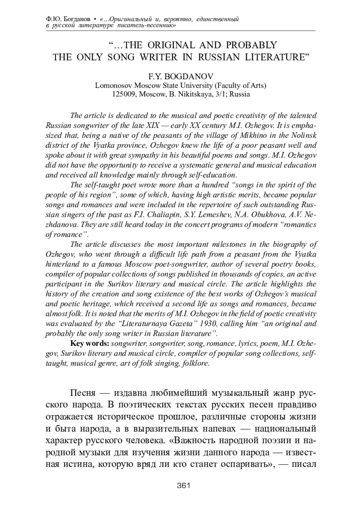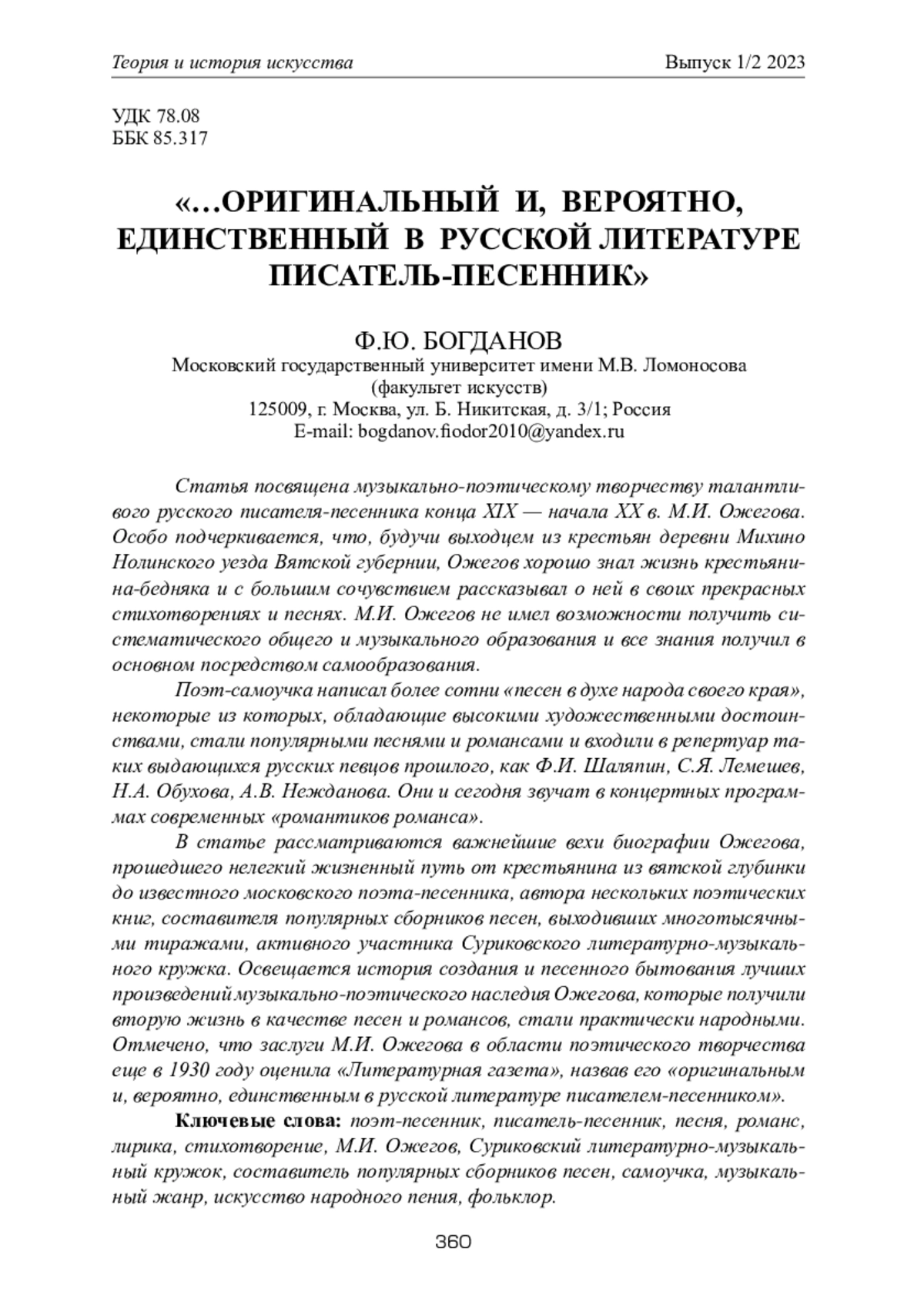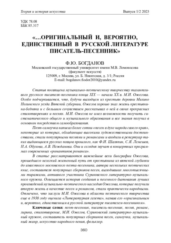 БОГДАНОВ Ф. Ю. ... ОРИГИНАЛЬНЫЙ И, ВЕРОЯТНО, ЕДИНСТВЕННЫЙ В РУССКОЙ ЛИТЕРАТУРЕ ПИСАТЕЛЬ-ПЕСЕННИК // ТЕОРИЯ И ИСТОРИЯ ИСКУССТВА. 2023. № 1-2