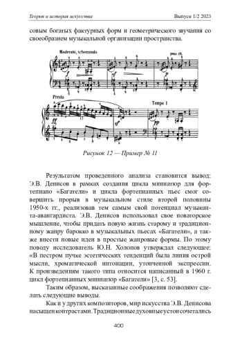 Э. В. Денисов вошел в историю музыки как смелый новатор, генератор новых идей, теоретик и исследователь искусства. Автор статьи анализирует фортепианные миниатюры, написанные Э. В. Денисовым в 1960–1980-е гг., в контексте новаторской концепции композитора в области музыкального жанра, стиля и композиционной техники XX в. Фортепианные миниатюры были для Э. В. Денисова глубочайшим способом выражения души, мыслей и эмоций, а также источником вдохновения в его новых творческих поисках. Произведения разных лет содержат развернутые, эмоционально наполненные мелодии и особую ритмическую систему: асимметричные сочетания, тактовые и нетактовые ритмические формы, ритмическую гармоническую последовательность, а также «серийность». Они обладают сочетанием богатой фактуры, нового ощущения звуковой геометрии и уникальности музыкального организационного пространства. В статье обобщаются рассмотренные особенности фортепианных миниатюр Э. Денисова, которые насыщены контрастами и сочетанием традиционных духовных устоев с новыми техниками композиторского письма, позволяющими воплощать новые идеи, для которых традиции стали источником вдохновения и мотивации
