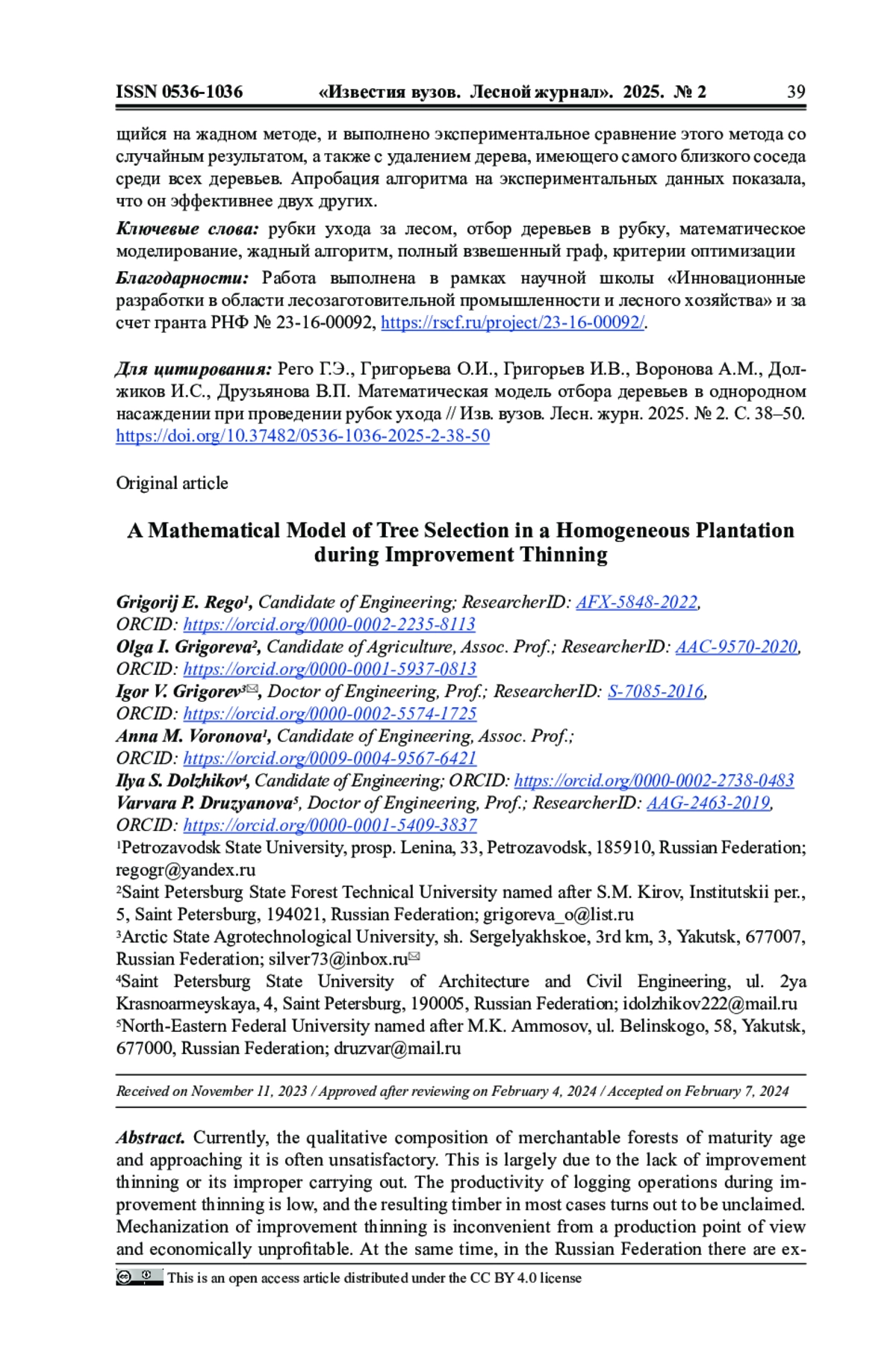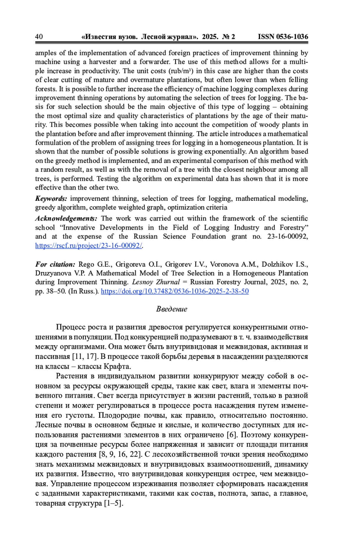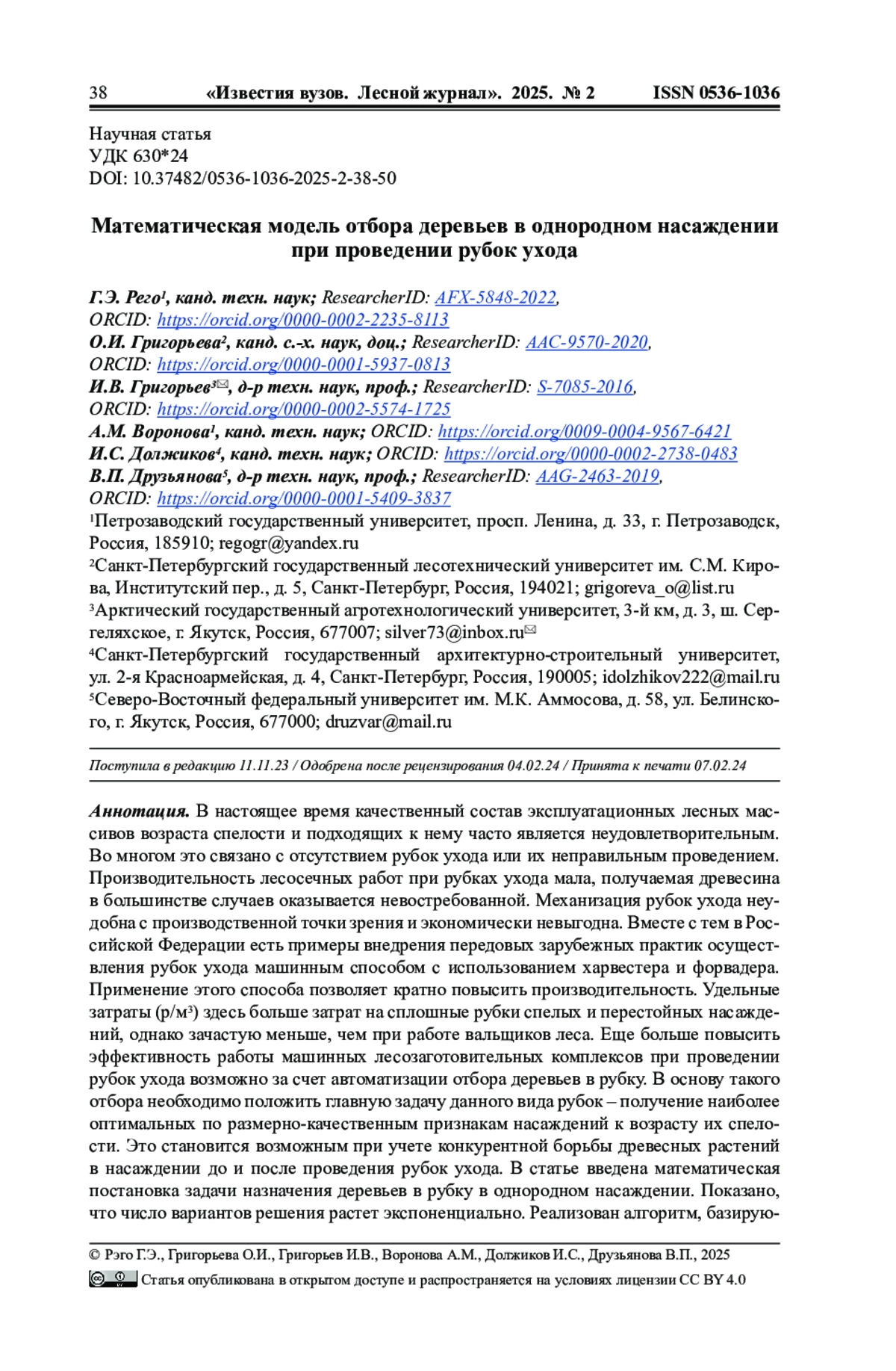 РЕГО Г. Э., ГРИГОРЬЕВА О. И., ГРИГОРЬЕВ И. В., ВОРОНОВА А. М., ДОЛЖИКОВ И. С., ДРУЗЬЯНОВА В. П. МАТЕМАТИЧЕСКАЯ МОДЕЛЬ ОТБОРА ДЕРЕВЬЕВ В ОДНОРОДНОМ НАСАЖДЕНИИ ПРИ ПРОВЕДЕНИИ РУБОК УХОДА // ИЗВЕСТИЯ ВЫСШИХ УЧЕБНЫХ ЗАВЕДЕНИЙ. ЛЕСНОЙ ЖУРНАЛ. 2025. № 2 (404)