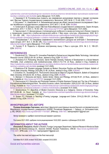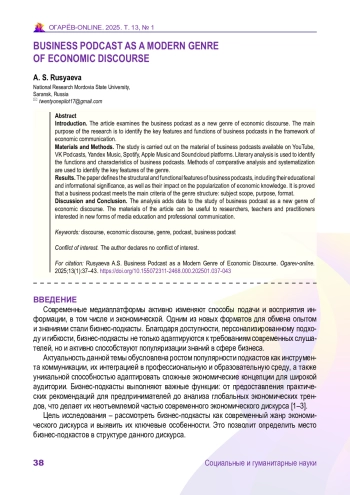 Обсуждение и заключение. Проведенный анализ дополняет представления о новом жанре экономического дискурса – бизнес-подкасте. Материалы статьи могут быть полезны исследователям, преподавателям и практикам, заинтересованным в новых формах медиаобразования и профессиональной коммуникации.