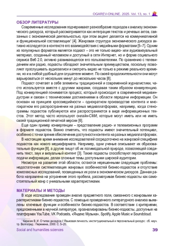 Материалы и методы. Исследование выполнено на материале бизнес-подкастов, доступных на платформах YouTube, VK Podcasts, «Яндекс Музыка», Spotify, Apple Music и Soundcloud. На основе литературного анализа выявлены ключевые функции и особенности бизнес-подкастов. Применены методы сравнительного анализа и систематизации, позволяющие определить ключевые черты жанра.