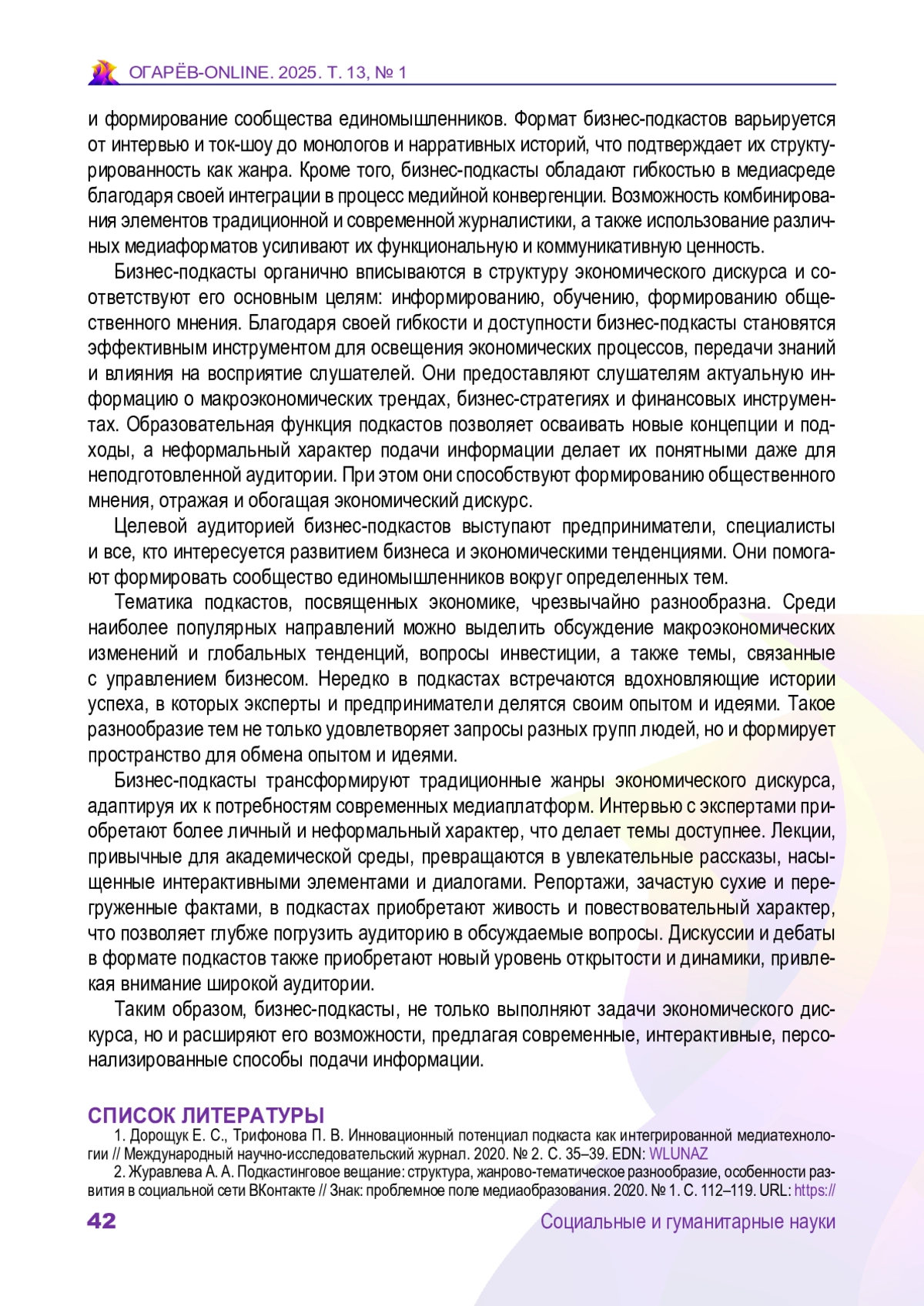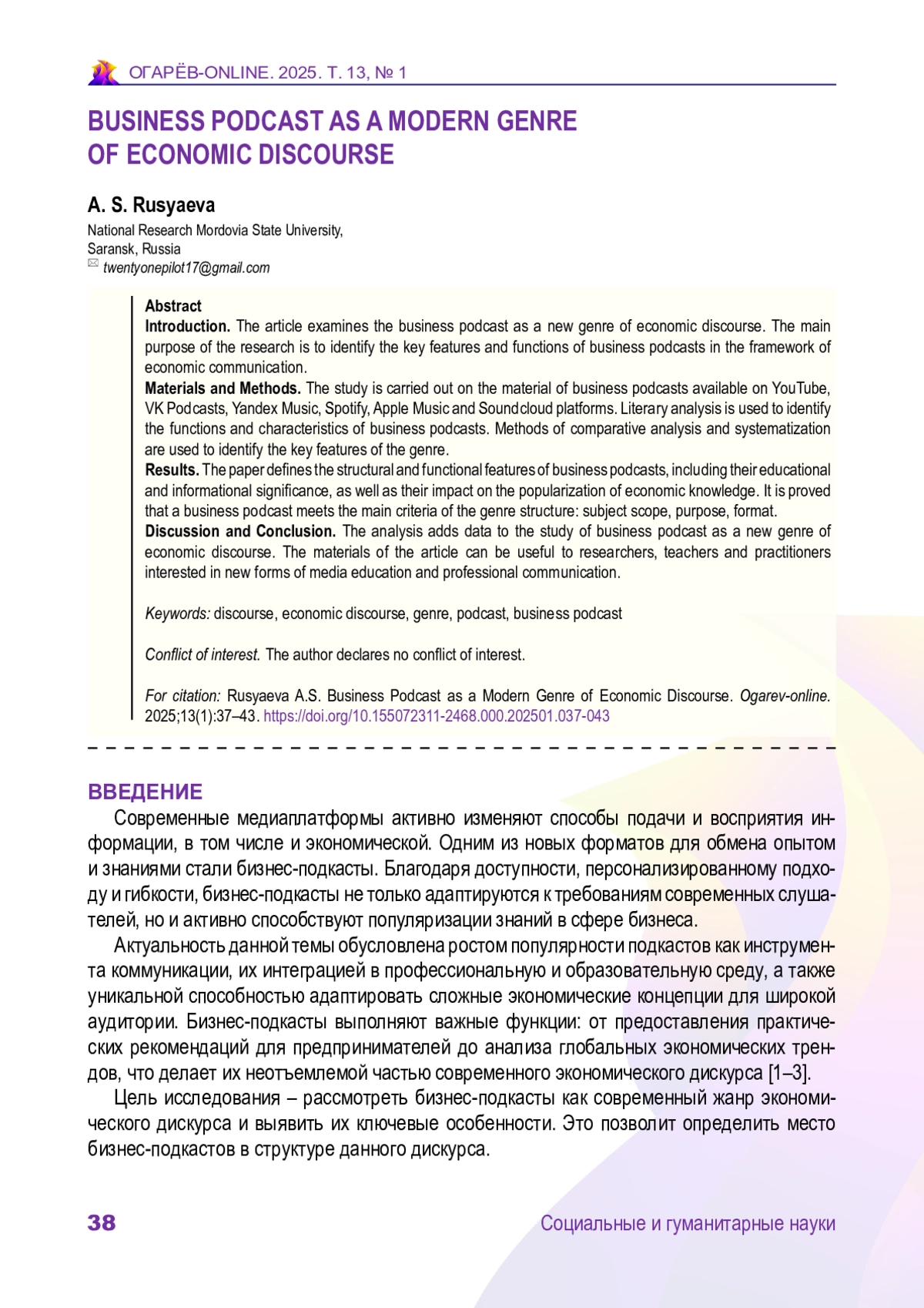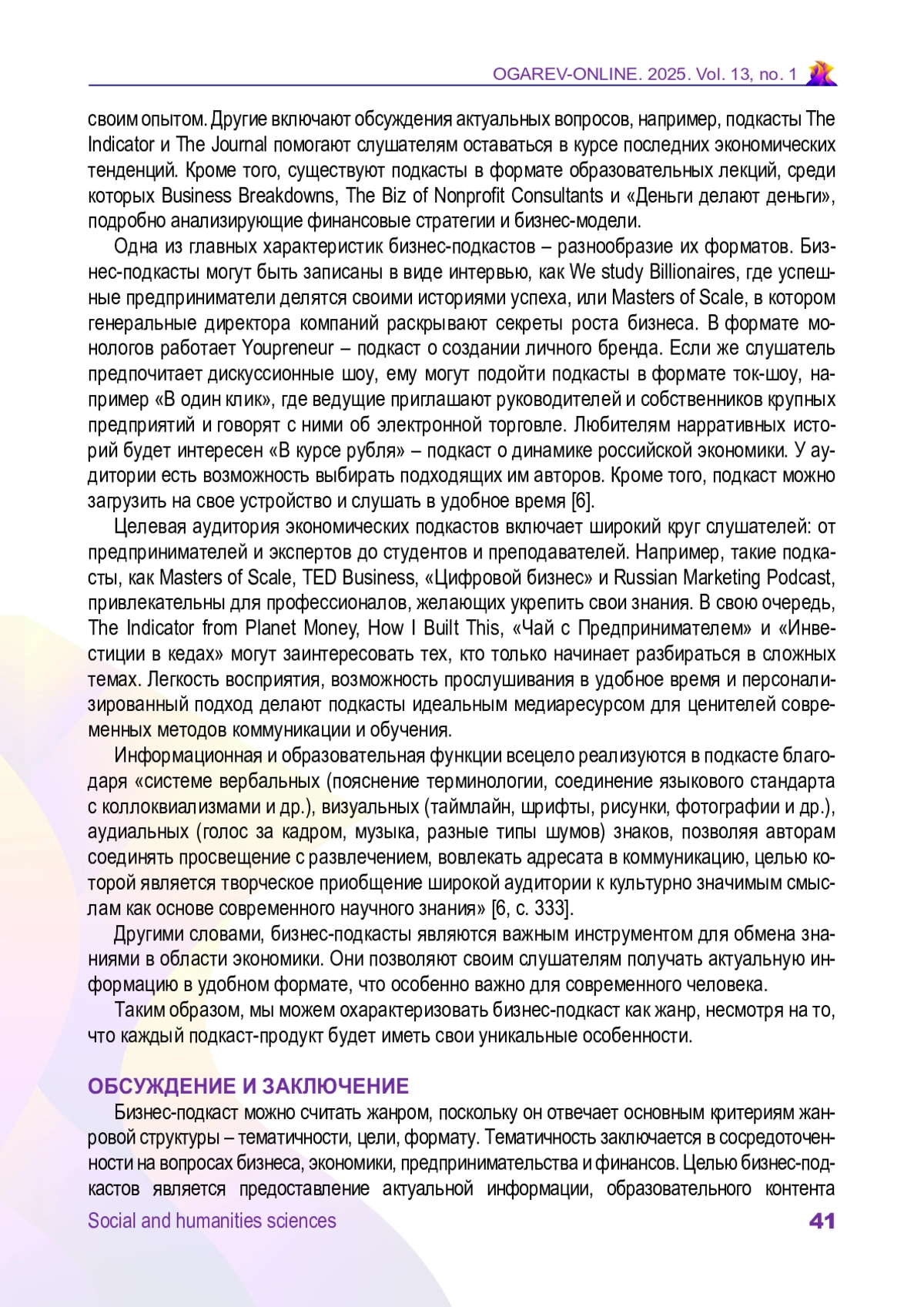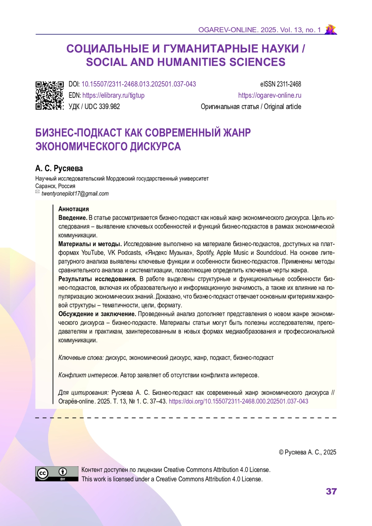 РУСЯЕВА А. С. БИЗНЕС-ПОДКАСТ КАК СОВРЕМЕННЫЙ ЖАНР ЭКОНОМИЧЕСКОГО ДИСКУРСА // ОГАРЁВ-ONLINE. 2025. № 1 (218), ТОМ 13