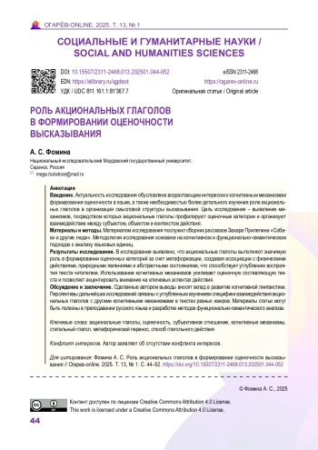 Обсуждение и заключение. Сделанные автором выводы вносят вклад в развитие когнитивной лингвистики. Перспективы дальнейших исследований связаны с углубленным изучением специфики взаимодействия акциональных глаголов с другими когнитивными механизмами в текстах разных жанров. Материалы статьи могут быть полезны в преподавании русского языка и разработке методов функционально-семантического анализа