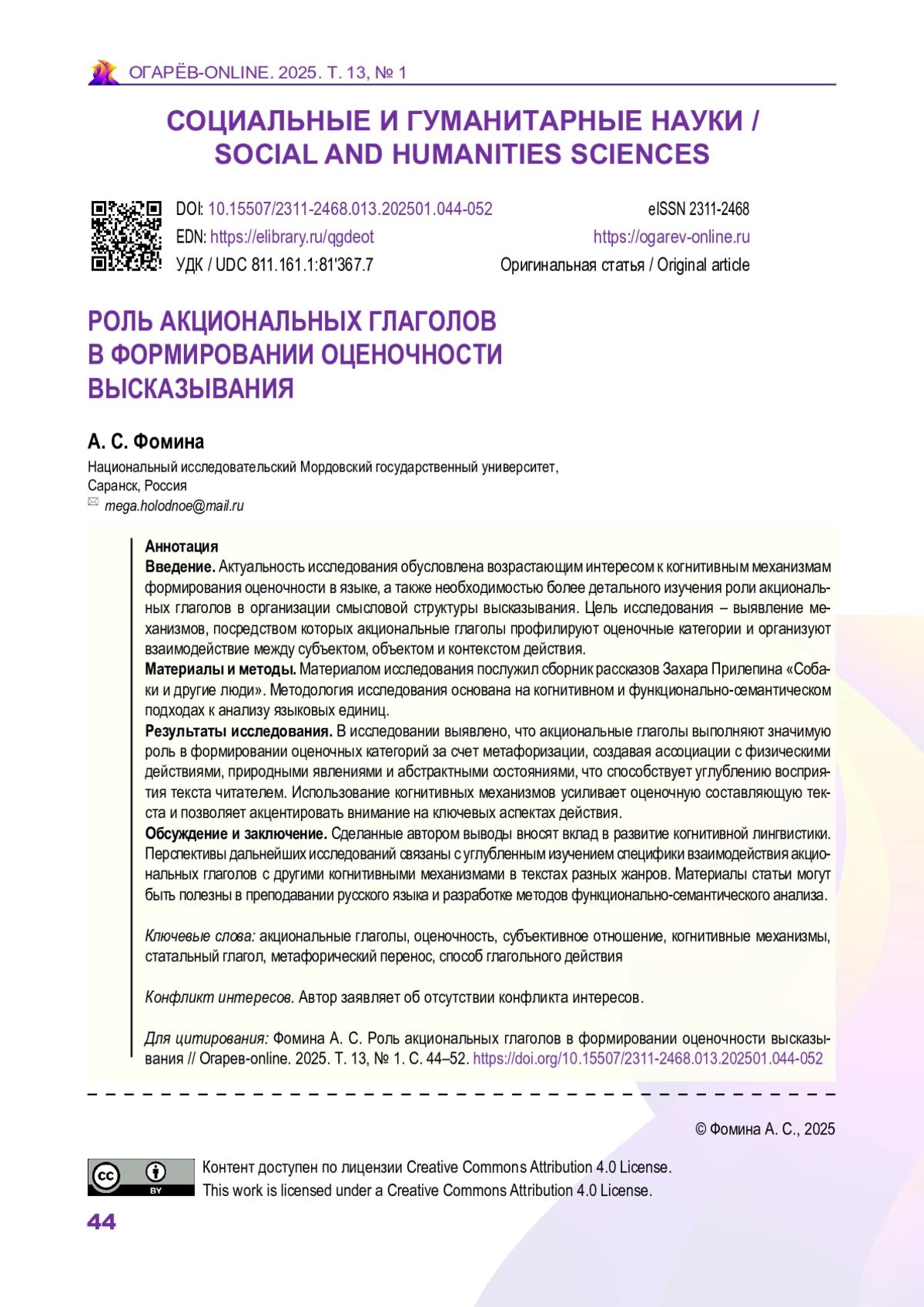 Введение. Актуальность исследования обусловлена возрастающим интересом к когнитивным механизмам формирования оценочности в языке, а также необходимостью более детального изучения роли акциональных глаголов в организации смысловой структуры высказывания. Цель исследования – выявление механизмов, посредством которых акциональные глаголы профилируют оценочные категории и организуют взаимодействие между субъектом, объектом и контекстом действия.