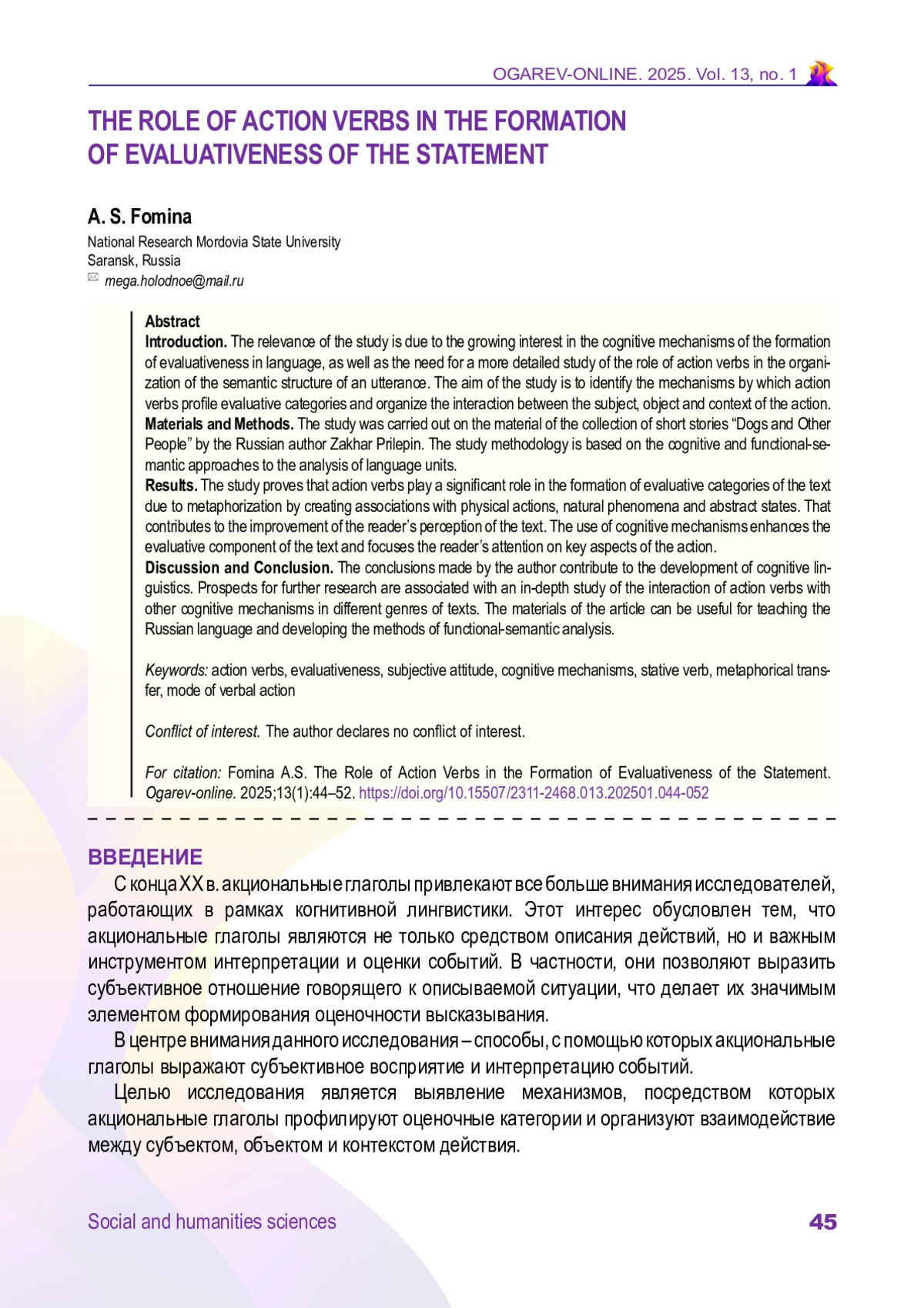 Результаты исследования. В исследовании выявлено, что акциональные глаголы выполняют значимую роль в формировании оценочных категорий за счет метафоризации, создавая ассоциации с физическими действиями, природными явлениями и абстрактными состояниями, что способствует углублению восприятия текста читателем. Использование когнитивных механизмов усиливает оценочную составляющую текста и позволяет акцентировать внимание на ключевых аспектах действия.
