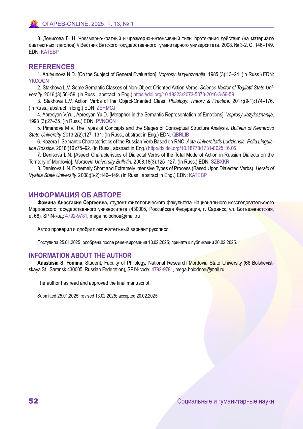 8. Денисова Л. Н. Чрезмерно-кратный и чрезмерно-интенсивный типы протекания действия (на материале диалектных глаголов) // Вестник Вятского государственного гуманитарного университета. 2008. № 3-2. С. 146-149.