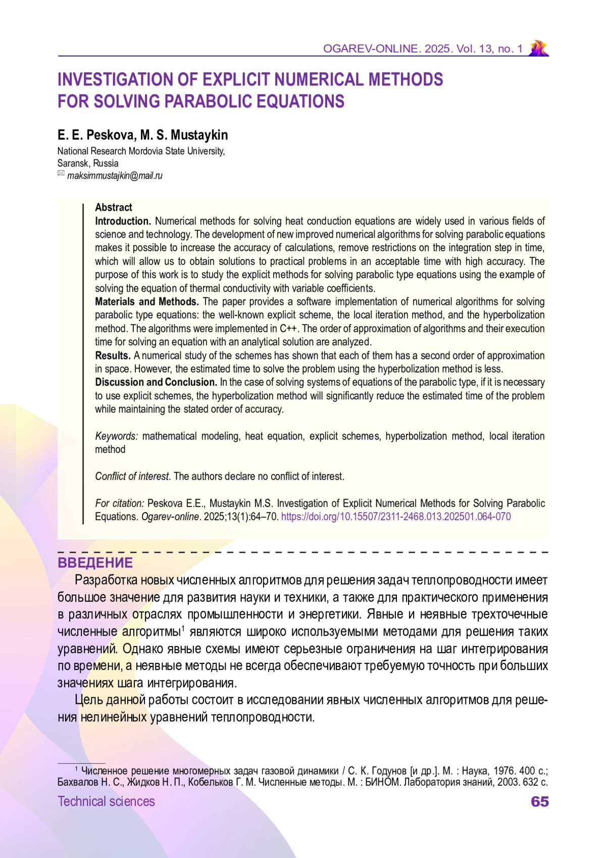 ПЕСКОВА Е. Е., МУСТАЙКИН М. С. ИССЛЕДОВАНИЕ ЯВНЫХ ЧИСЛЕННЫХ МЕТОДОВ РЕШЕНИЯ УРАВНЕНИЙ ПАРАБОЛИЧЕСКОГО ТИПА // ОГАРЁВ-ONLINE. 2025. № 1 (218), ТОМ 13