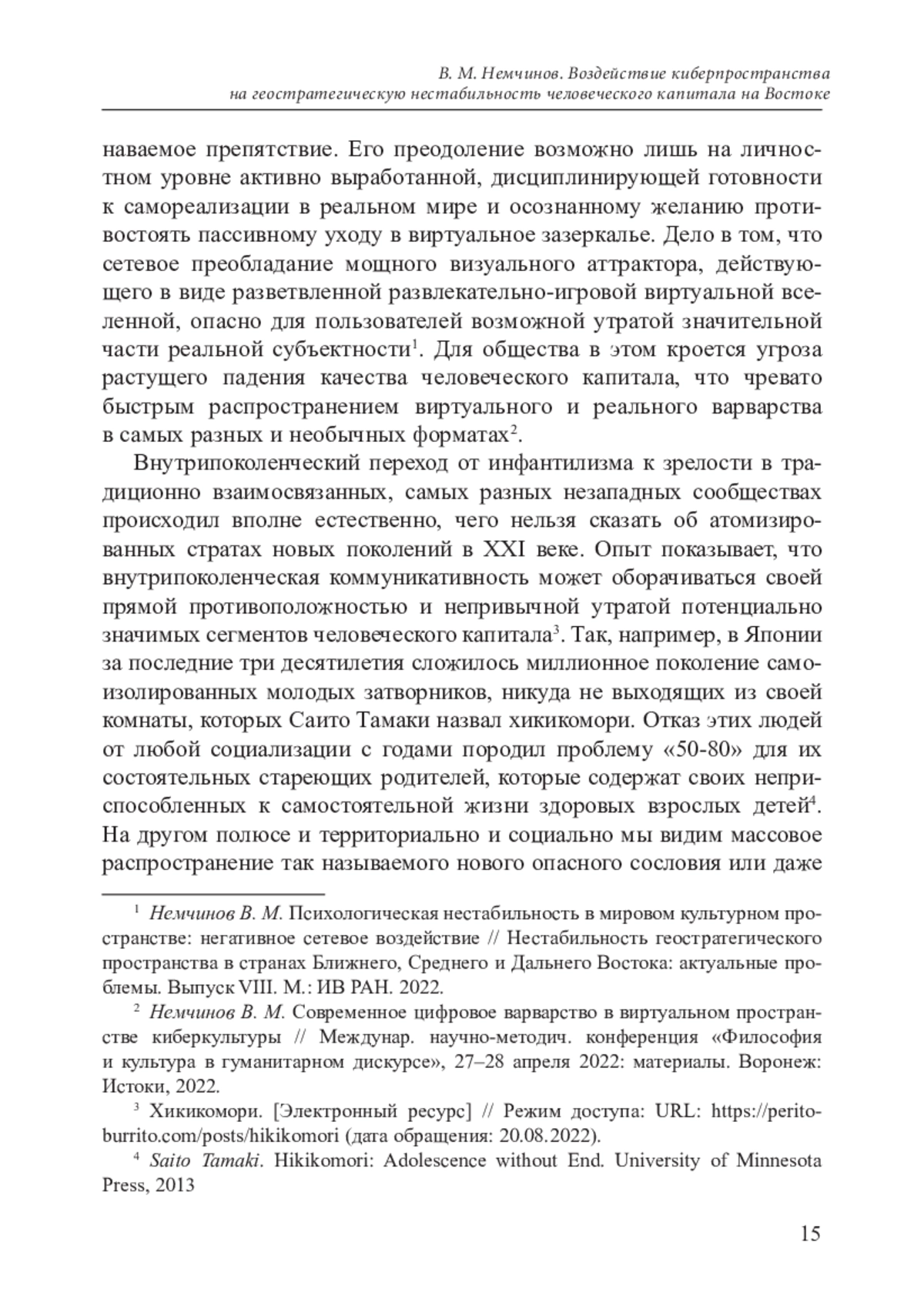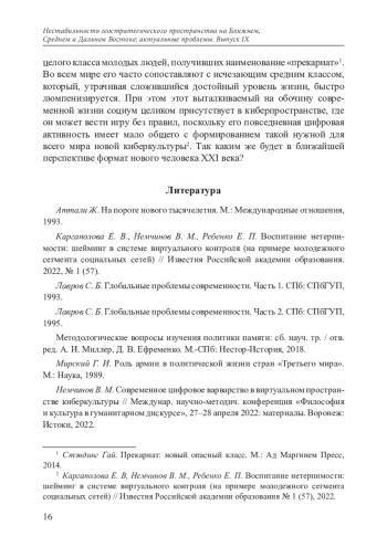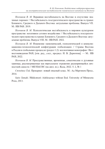 8. Немчинов В. М. Психологическая нестабильность в мировом культурном пространстве: негативное сетевое воздействие // Нестабильность геостратегического пространства в странах Ближнего, Среднего и Дальнего Востока: актуальные проблемы. Выпуск VIII. М.: ИВ РАН. 2022. EDN: TPYZWU