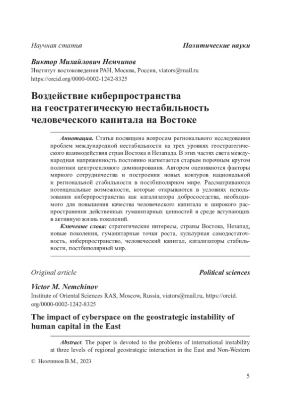 Статья посвящена вопросам регионального исследования проблем международной нестабильности на трех уровнях геостратегического взаимодействия стран Востока и Незапада. В этих частях света международная напряженность постоянно нагнетается старым порочным кругом политики центросилового доминирования. Автором оцениваются факторы мирного сотрудничества и построения новых контуров национальной и региональной стабильности в постбиполярном мире. Рассматриваются потенциальные возможности, которые открываются в условиях использования киберпространства как катализатора добрососедства, необходимого для повышения качества человеческого капитала и широкого распространения действенных гуманитарных ценностей в среде вступающих в активную жизнь поколений.