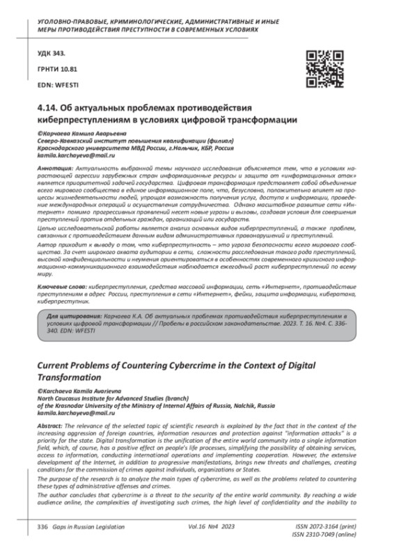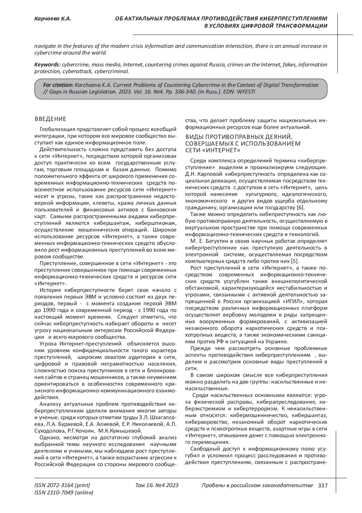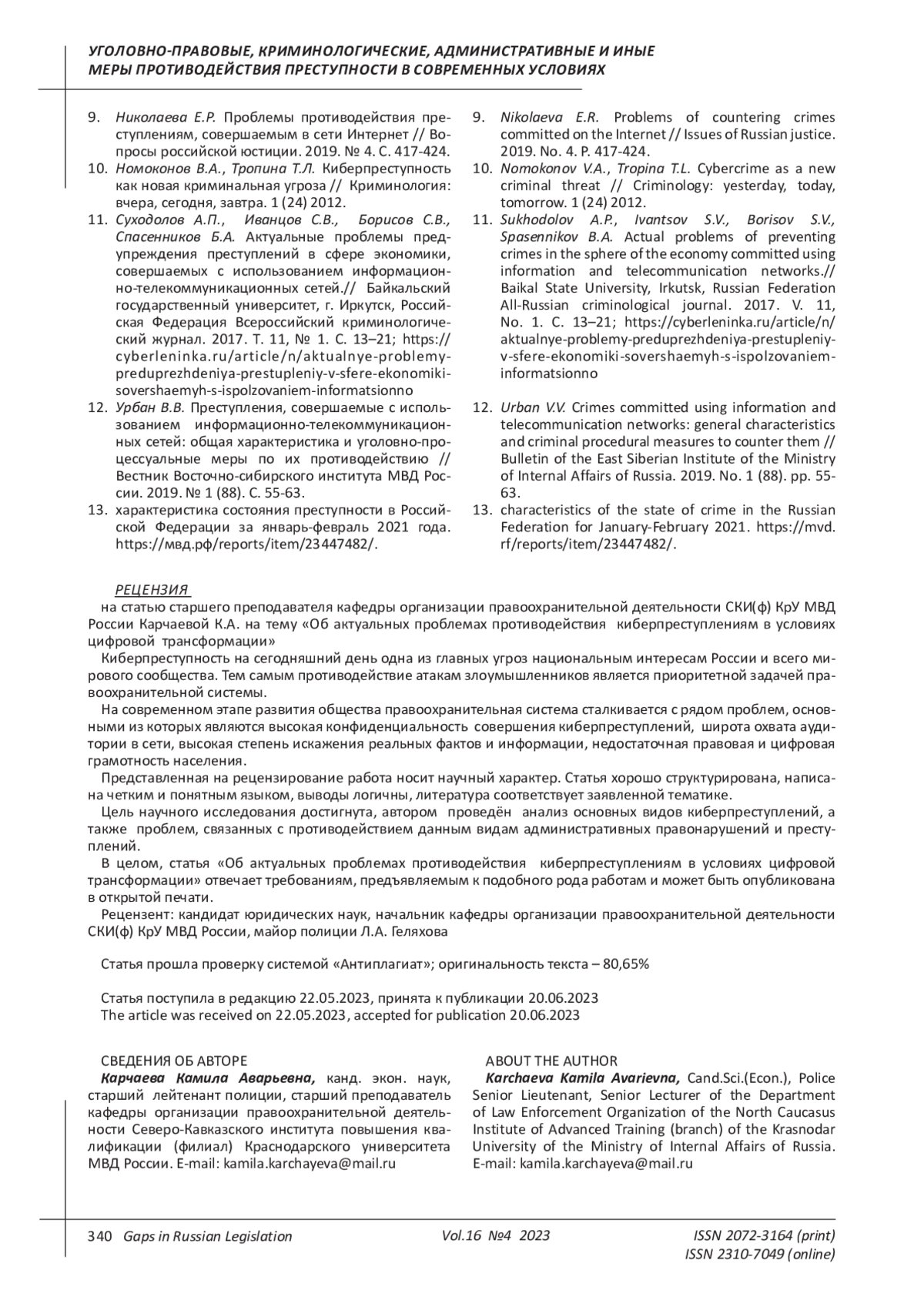 КАРЧАЕВА К. А. ОБ АКТУАЛЬНЫХ ПРОБЛЕМАХ ПРОТИВОДЕЙСТВИЯ КИБЕРПРЕСТУПЛЕНИЯМ В УСЛОВИЯХ ЦИФРОВОЙ ТРАНСФОРМАЦИИ // ПРОБЕЛЫ В РОССИЙСКОМ ЗАКОНОДАТЕЛЬСТВЕ. 2023. Т. 16 № 4