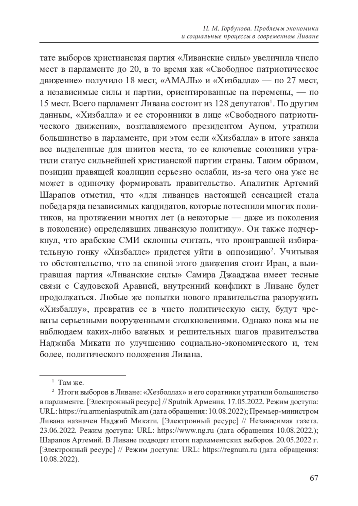 4. Горбунова Н. М. Ливанский кризис: трансформация общества и государства // Восток-Oriens. 2013. № 4. Ланда Р. Г. История Ливана. ХХ век. М.: ИВ РАН. 2016. EDN: RESGEF