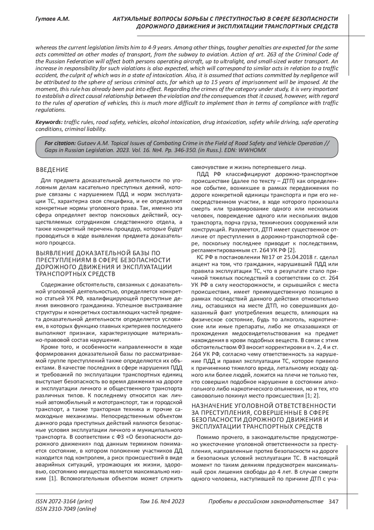 6. Гутаев А.М. Правовые основы предупреждения преступлений в сфере безопасности дорожного движения // Пробелы в российском законодательстве. 2021. Т. 14. №3. С. 154-157. EDN: OAWJZU