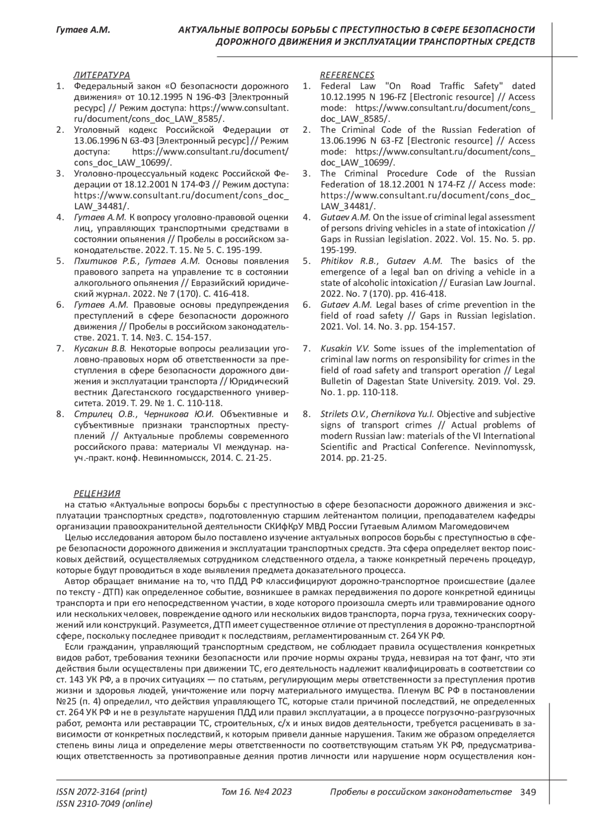 5. Пхитиков Р.Б., Гутаев А.М. Основы появления правового запрета на управление тс в состоянии алкогольного опьянения // Евразийский юридический журнал. 2022. № 7 (170). С. 416-418. EDN: LUNFOE