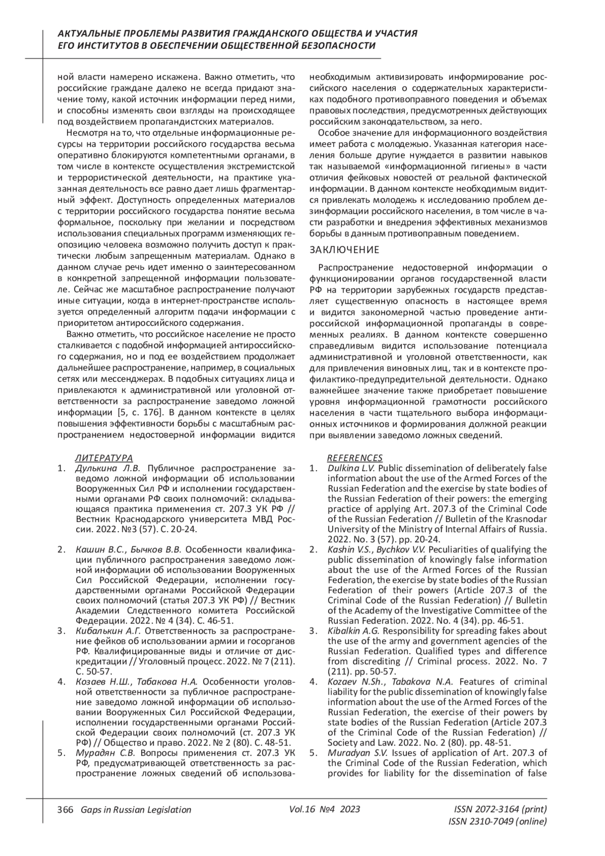 1. Дулькина Л.В. Публичное распространение заведомо ложной информации об использовании Вооруженных Сил РФ и исполнении государственными органами РФ своих полномочий: складывающаяся практика применения ст. 207.3 УК РФ // Вестник Краснодарского университета МВД России. 2022. №3 (57). С. 20-24. EDN: DFHYAK