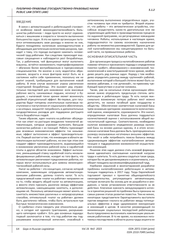 В данной статье рассмотрены предпосылки возникновения, роль и перспективы реализации так называемого «налога на роботов». На данный момент уже можно проследить нарастающую тенденцию вытеснения и замены машинами человеческого труда. Так, автоматизация производственных процессов становится всё более популярна и выгодна для компаний, что ставит под угрозу востребованность людей в осуществлении их трудовой деятельности. Актуальность обусловлена тем, что роботизация и автоматизация производства вызывают ряд как положительных, так и отрицательных последствий для экономики и общества в целом. Наша задача при реализации данной политики состоит в том, чтобы предложить наиболее оптимальный и эффективный метод налогового регулирования использования машин, заменяющих и вытесняющих рабочих. Однако, сложность заключается в нахождении наилучшего способа обложения, который бы не ограничивал внедрение инноваций и не препятствовал достижению экономического роста. Для этого необходимо определить значение понятия «робот», проанализировать, какие основные проблемы могут возникнуть в ходе реализации налоговой политики по обложению роботов, далее - обозначить основные подходы и варианты реализации их налогообложения и, ориентируясь на существующие мировые практики, выявить наиболее приемлемые и подходящие нам методики.