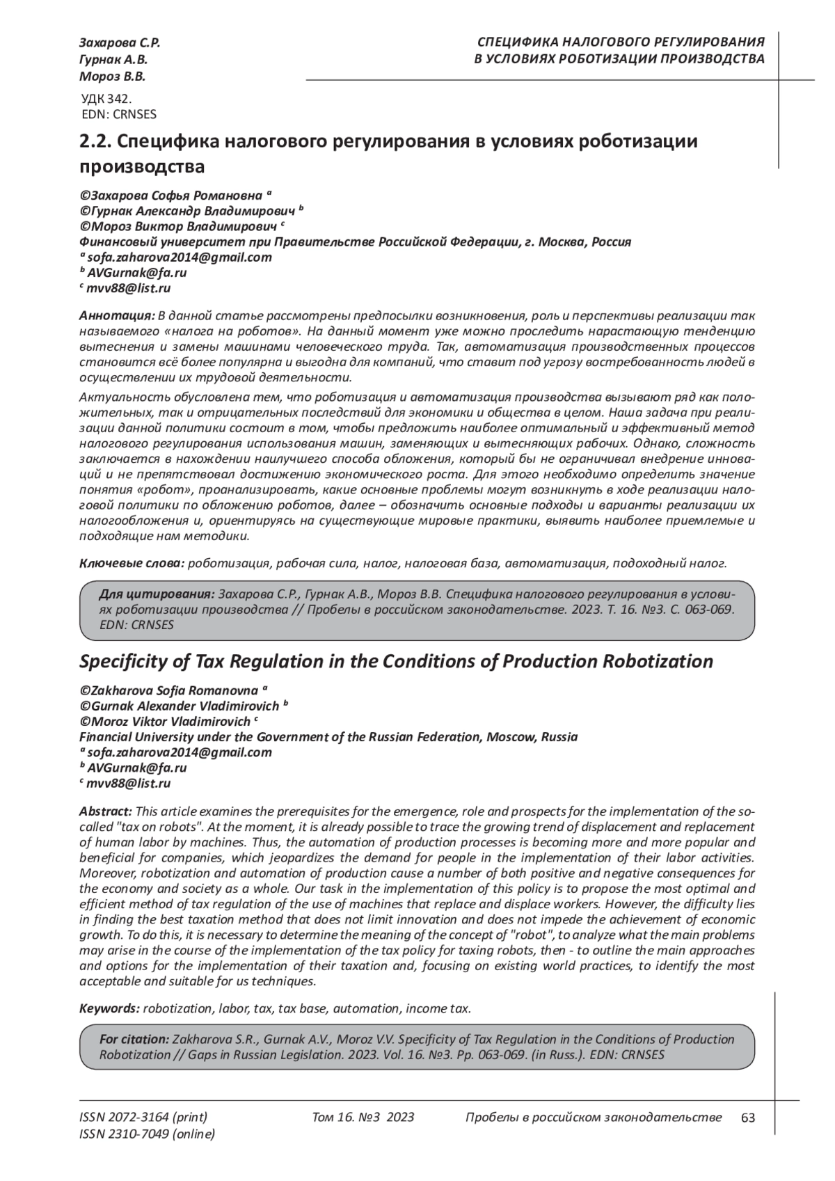 5. Abbott R. and Bogenschneider B. Should Robots Pay Taxes? Tax Policy in the Age of Automation // Harvard Law & Policy Review - 2018 - pp. 146-175.