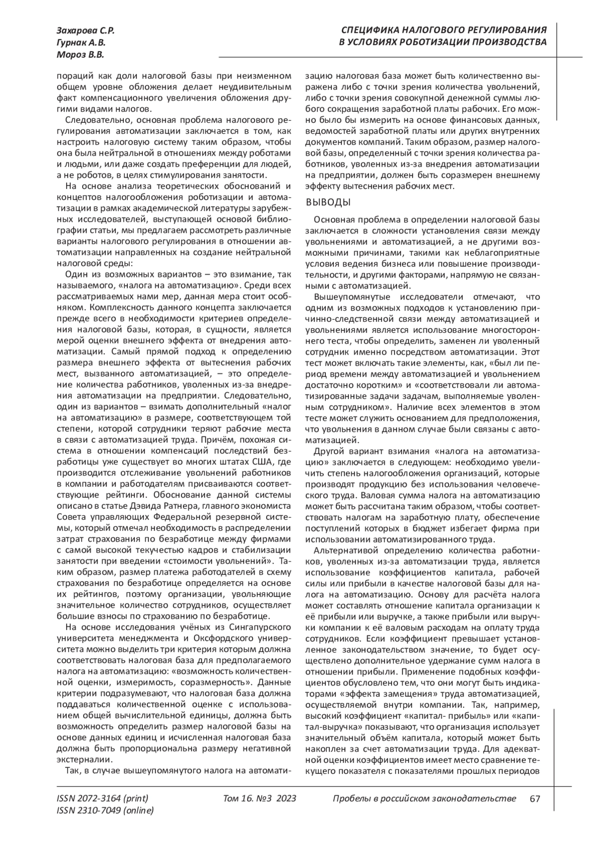 3. Гончаренко Л. И., Адвокатова А. С., Малкова Ю. В. Круглый стол “актуальные вопросы трансформации налогообложения в условиях глобальных изменений”. Экономика. Налоги. Право. - 2020. - С. 170-172.