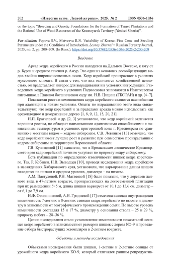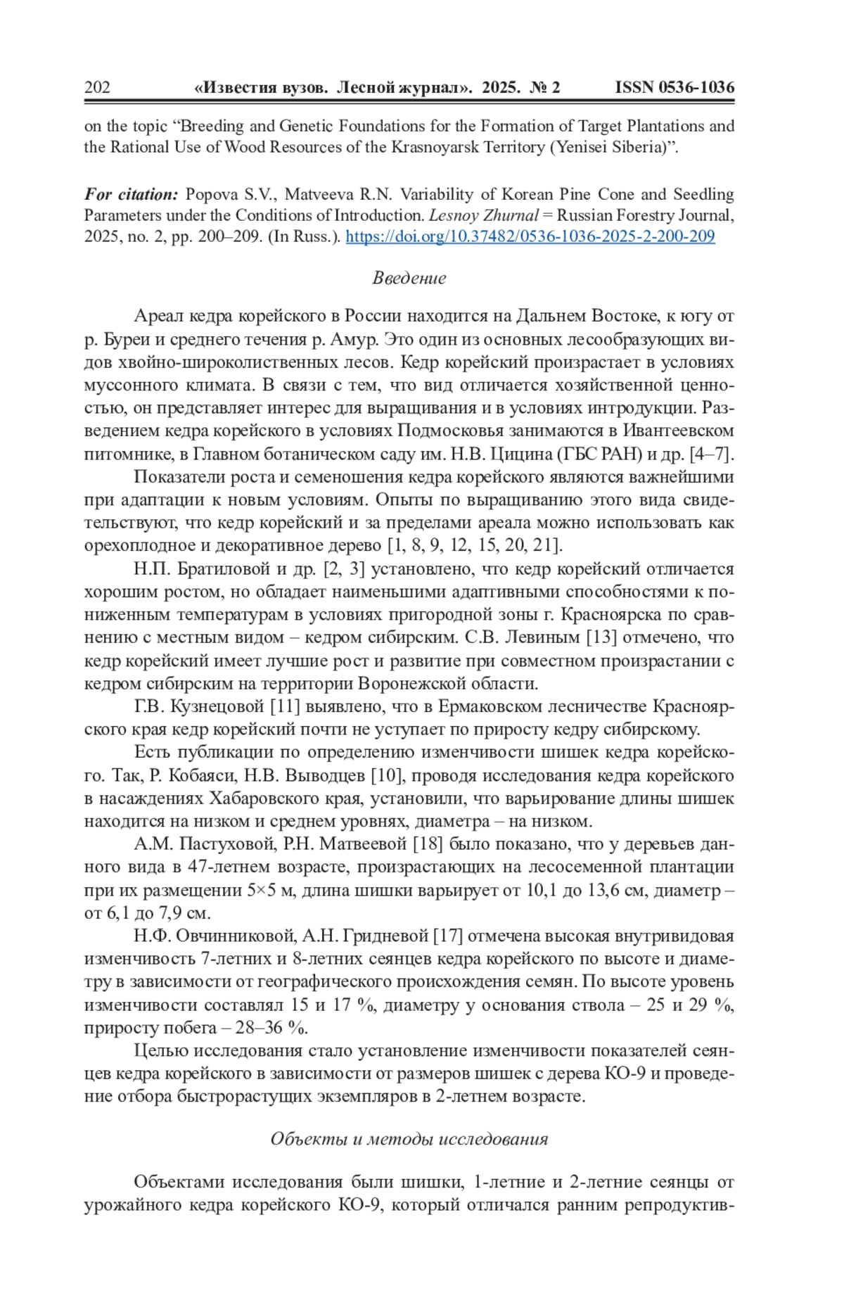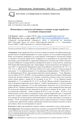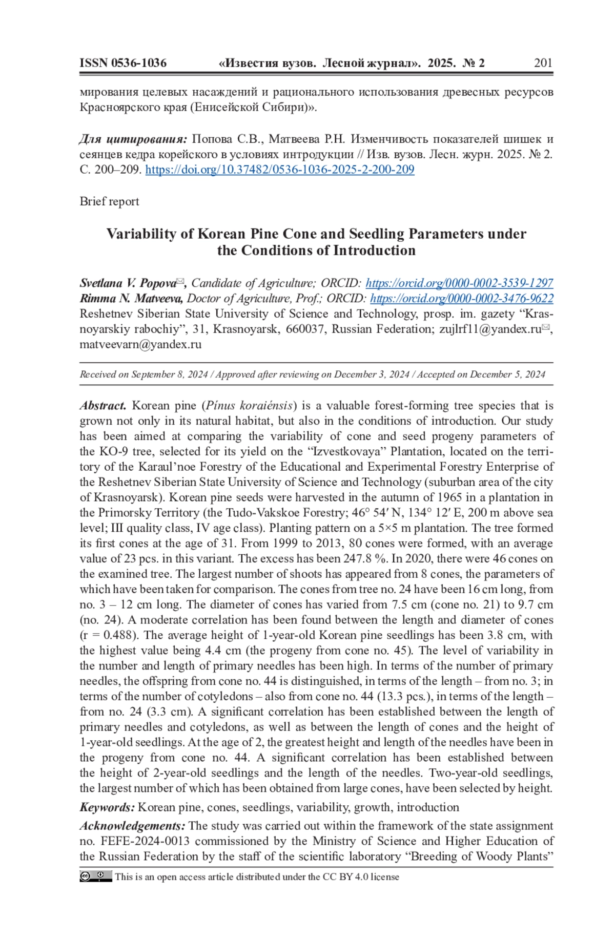 ПОПОВА С. В., МАТВЕЕВА Р. Н. ИЗМЕНЧИВОСТЬ ПОКАЗАТЕЛЕЙ ШИШЕК И СЕЯНЦЕВ КЕДРА КОРЕЙСКОГО В УСЛОВИЯХ ИНТРОДУКЦИИ // ИЗВЕСТИЯ ВЫСШИХ УЧЕБНЫХ ЗАВЕДЕНИЙ. ЛЕСНОЙ ЖУРНАЛ. 2025. № 2 (404)