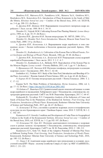 Кедр корейский (Pínus koraiénsis) является ценным лесообразующим древесным видом, который выращивают не только в ареале, но и в условиях интродукции. Наше исследование направлено на сопоставление изменчивости показателей шишек и семенного потомства дерева КО-9, отобранного по урожайности на плантации «Известковая», расположенной на территории Караульного лесничества Учебно-опытного лесхоза Сибирского государственного университета науки и технологий им. академика М. Ф. Решетнёва (пригородная зона г. Красноярка). Семена кедра были заготовлены осенью 1965 г. в насаждении Приморского края (Тудо-Вакское лесничество; 46° 54’ с. ш. 134° 12’ в. д., 200 м над ур. м.; III класс бонитета, IV класс возраста). Схема посадки на плантации - 5×5 м. Дерево в возрасте 31 год образовало первые шишки. С 1999 по 2013 гг. их сформировалось 80 шт., при среднем значении в данном варианте - 23 шт. Превышение составило 247,8 %. В 2020 г. на обследованном дереве было 46 шишек. Наибольшее количество всходов появилось из 8 шишек, показатели которых взяты для сопоставления. Длина шишек с дерева No 24 составила 16 см, No 3 - 12 см. Диаметр шишек варьировал от 7,5 см (шишка No 21) до 9,7 см (No 24). Между длиной и диаметром шишек установлена умеренная теснота связи (r = 0,488). Средняя высота 1-летних сеянцев кедра корейского равнялась 3,8 см, при наибольшем показателе 4,4 см (потомство из шишки No 45). Уровень изменчивости по количеству и длине первичной хвои высокий. По количеству первичной хвои выделяется потомство из шишки No 44, длине - No 3; по количеству семядолей - также из шишки No 44 (13,3 шт.), по длине - No 24 (3,3 см). Значительная теснота связи установлена между длиной первичной хвои и семядолей, высотой 1-летних сеянцев и количеством семядолей, длиной шишек и высотой 1-летних сеянцев. В 2-летнем возрасте наибольшая высота и длина хвои были у потомства из шишки - No 44. Установлена значительная теснота связи для высоты 2-летних сеянцев и длины хвои. Двухлетние сеянцы, наибольшее количество которых получено из крупных шишек, были отселектированы по высоте.
