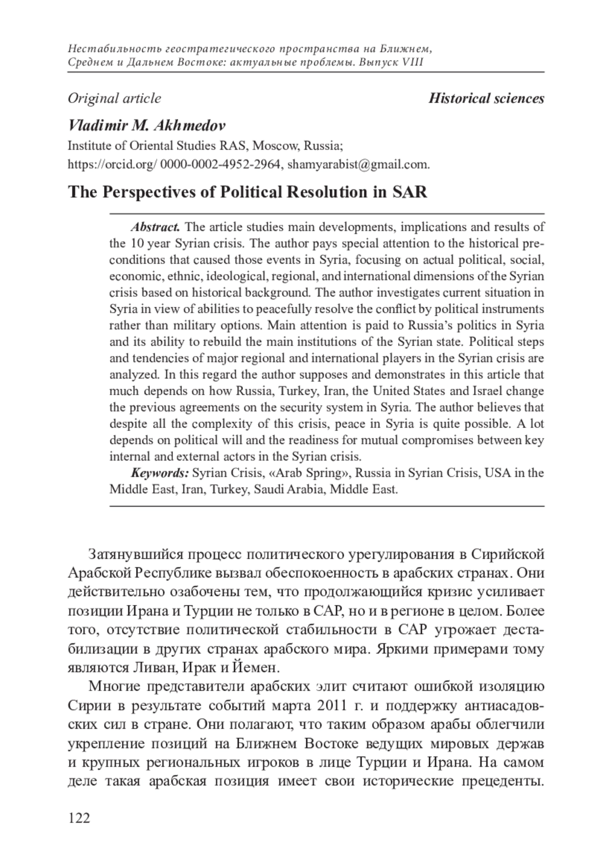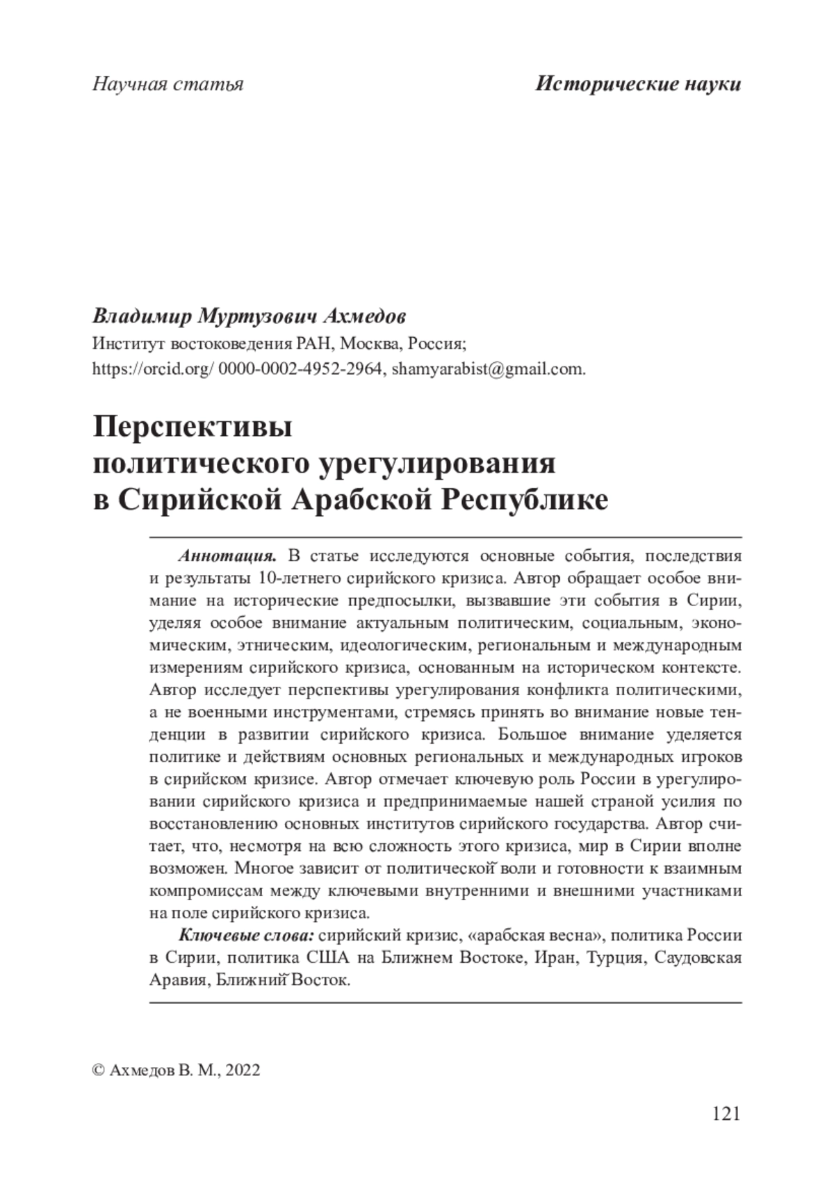 В статье исследуются основные события, последствия и результаты 10-летнего сирийского кризиса. Автор обращает особое внимание на исторические предпосылки, вызвавшие эти события в Сирии, уделяя особое внимание актуальным политическим, социальным, экономическим, этническим, идеологическим, региональным и международным измерениям сирийского кризиса, основанным на историческом контексте. Автор исследует перспективы урегулирования конфликта политическими, а не военными инструментами, стремясь принять во внимание новые тенденции в развитии сирийского кризиса. Большое внимание уделяется политике и действиям основных региональных и международных игроков в сирийском кризисе. Автор отмечает ключевую роль России в урегулировании сирийского кризиса и предпринимаемые нашей страной усилия по восстановлению основных институтов сирийского государства. Автор считает, что, несмотря на всю сложность этого кризиса, мир в Сирии вполне возможен. Многое зависит от политической̆ воли и готовности к взаимным компромиссам между ключевыми внутренними и внешними участниками на поле сирийского кризиса.