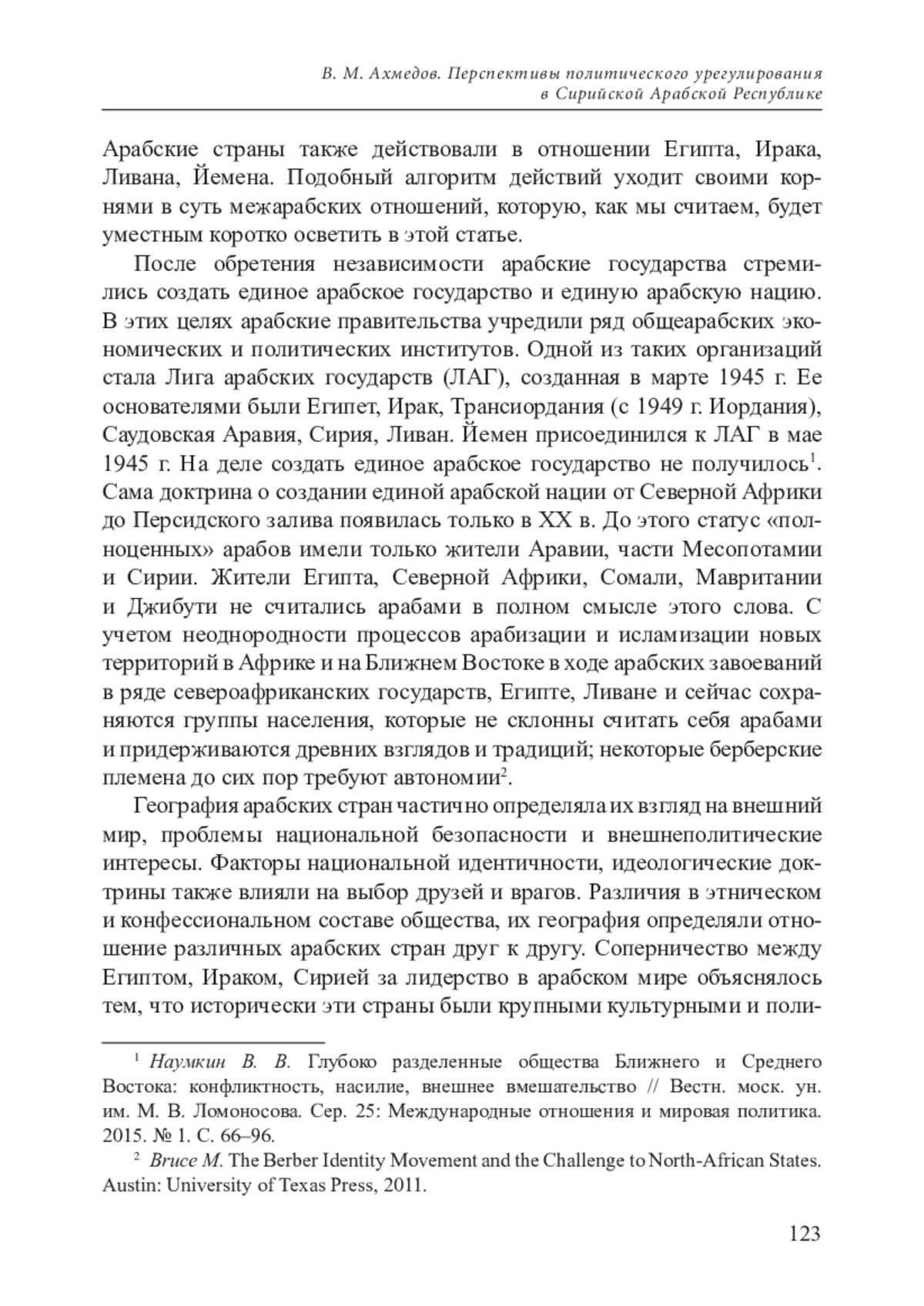 1. Наумкин В. В. Глубоко разделенные общества Ближнего и Среднего Востока: конфликтность, насилие, внешнее вмешательство. // Вестн. моск. гос. ун. Сер. 25: Международные отношения и мировая политика. 2015. № 1.