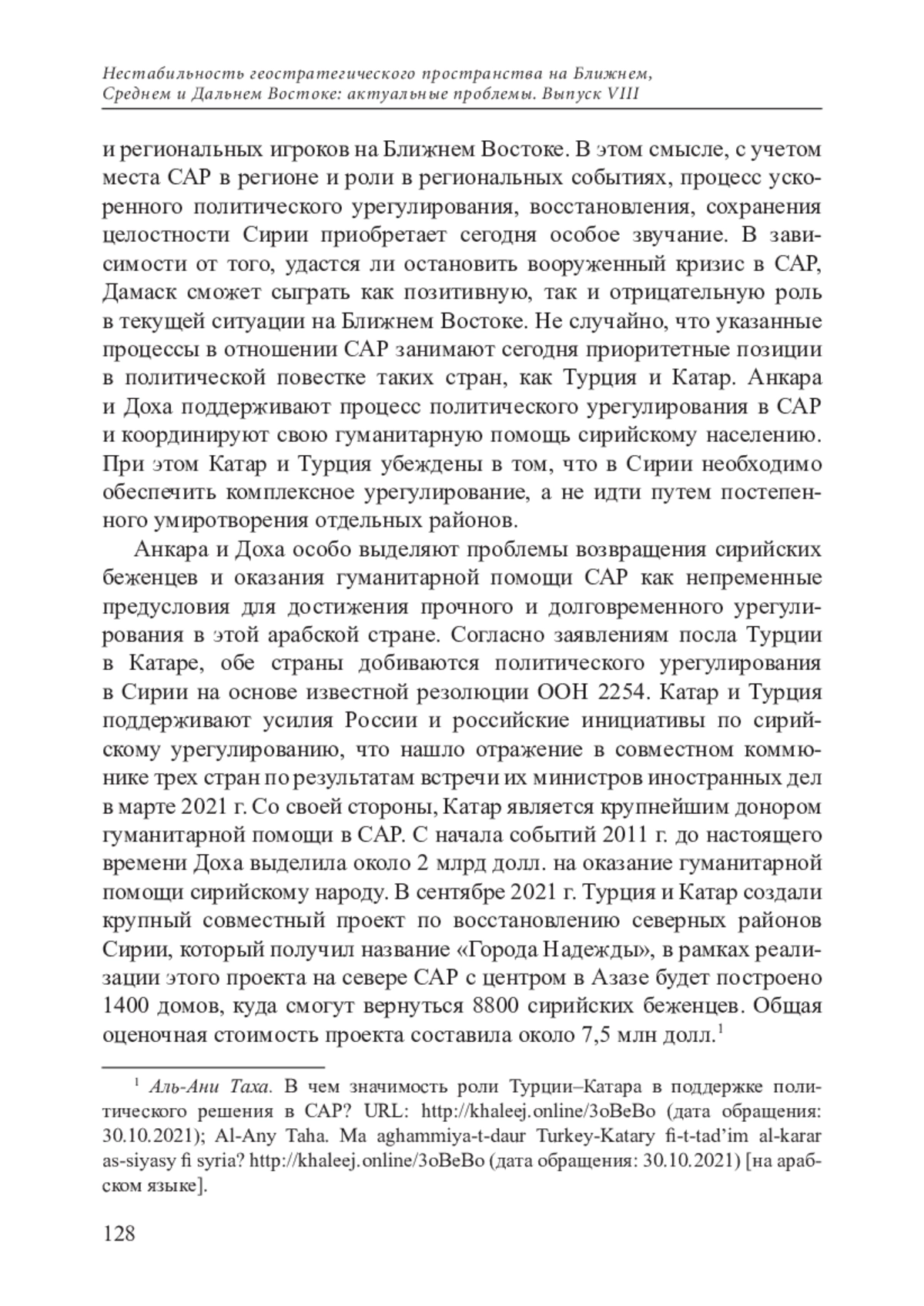 Затянувшийся процесс политического урегулирования в Сирийской Арабской Республике вызвал обеспокоенность в арабских странах. Они действительно озабочены тем, что продолжающийся кризис усиливает позиции Ирана и Турции не только в САР, но и в регионе в целом. Более того, отсутствие политической стабильности в САР угрожает дестабилизации в других странах арабского мира. Яркими примерами тому являются Ливан, Ирак и Йемен.
