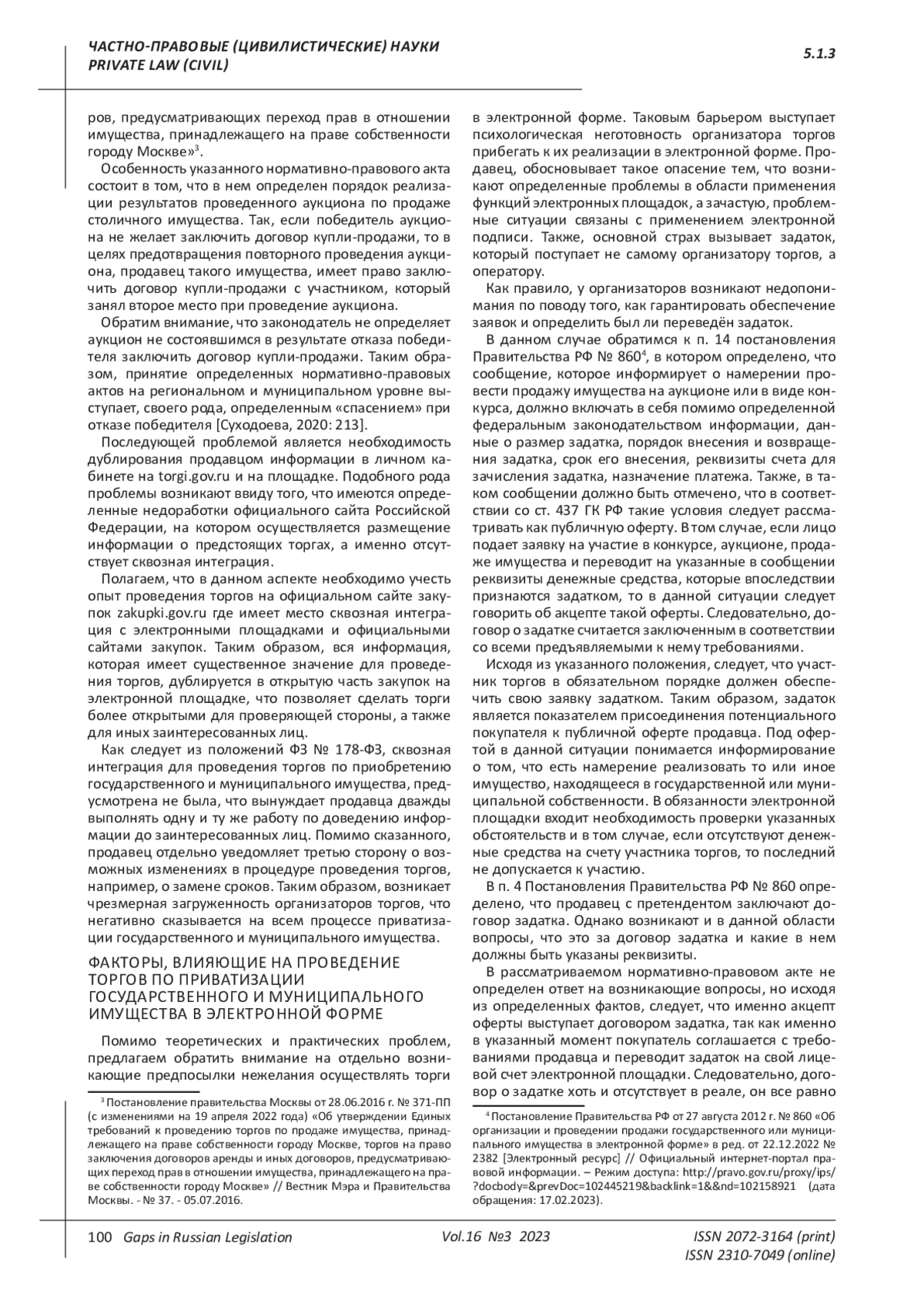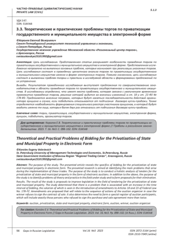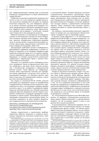 Статья: ТЕОРЕТИЧЕСКИЕ И ПРАКТИЧЕСКИЕ ПРОБЛЕМЫ ТОРГОВ ПО ПРИВАТИЗАЦИИ ГОСУДАРСТВЕННОГО И МУНИЦИПАЛЬНОГО ИМУЩЕСТВА В ЭЛЕКТРОННОЙ ФОРМЕ (2023)