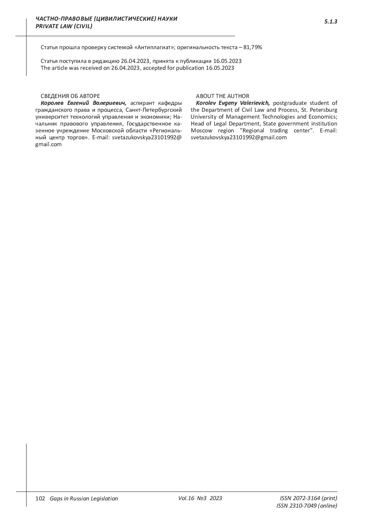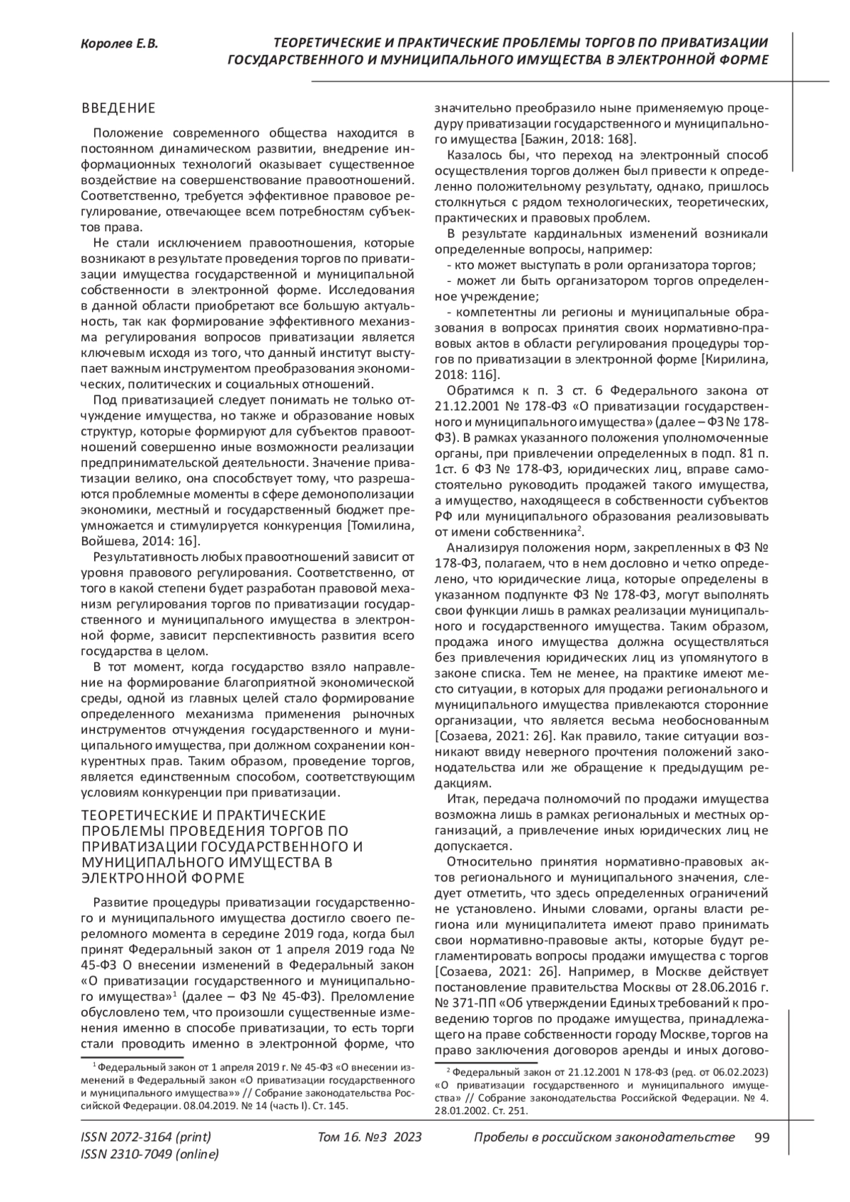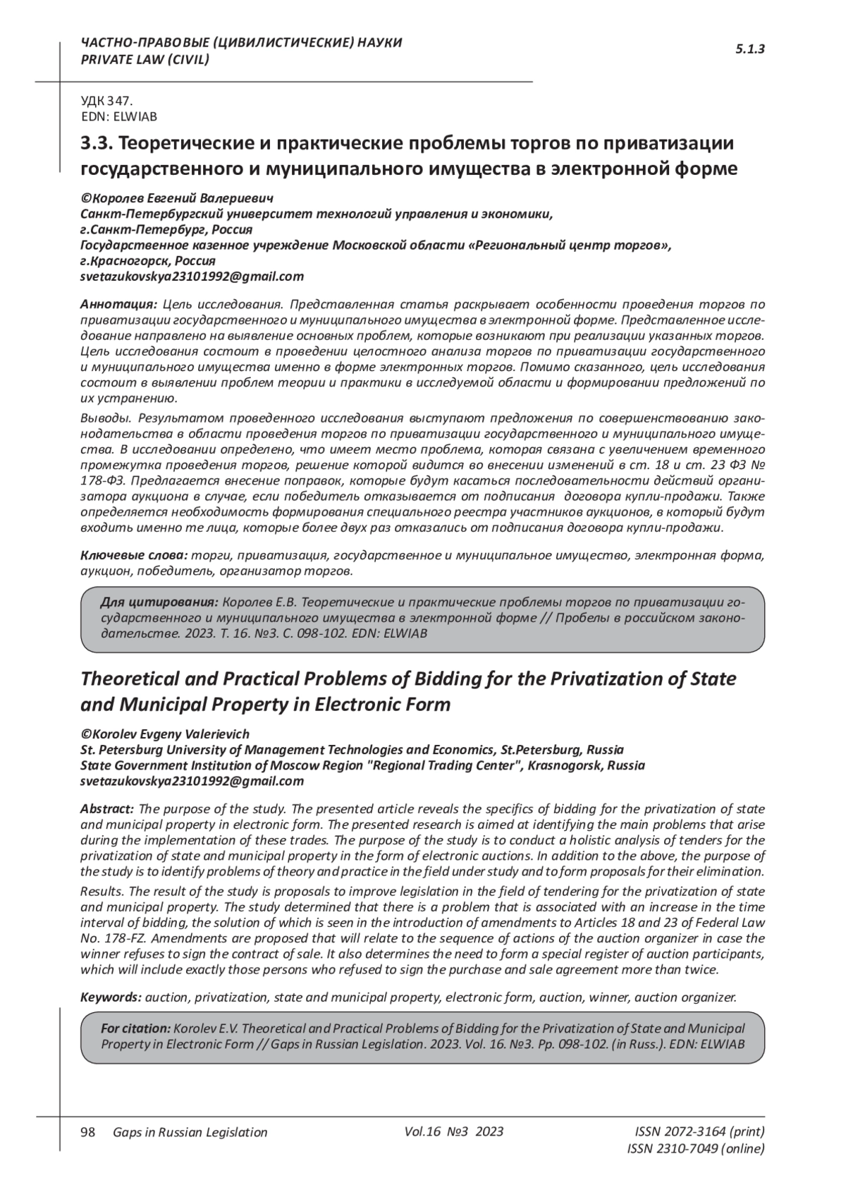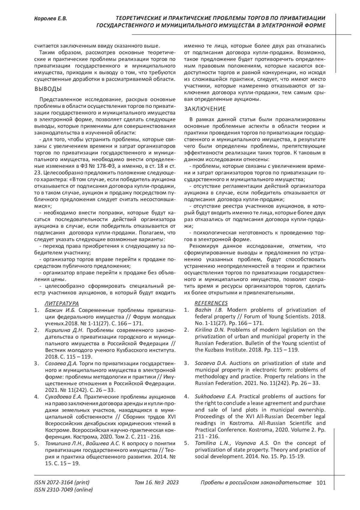 КОРОЛЕВ Е. В. ТЕОРЕТИЧЕСКИЕ И ПРАКТИЧЕСКИЕ ПРОБЛЕМЫ ТОРГОВ ПО ПРИВАТИЗАЦИИ ГОСУДАРСТВЕННОГО И МУНИЦИПАЛЬНОГО ИМУЩЕСТВА В ЭЛЕКТРОННОЙ ФОРМЕ // ПРОБЕЛЫ В РОССИЙСКОМ ЗАКОНОДАТЕЛЬСТВЕ. 2023. Т. 16 № 3