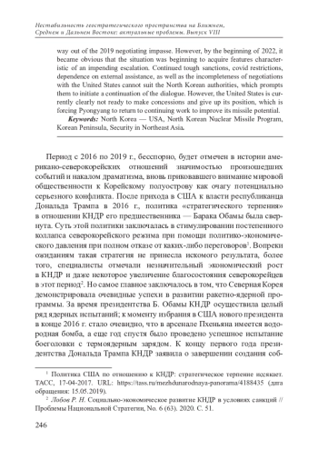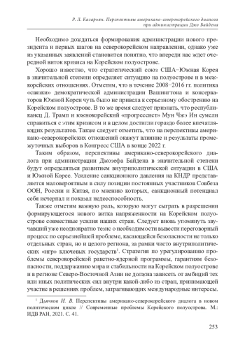 1. Дьячков И. В. Перспективы американо-северокорейского диалога в новом политическом цикле // Современные проблемы Корейского полуострова. М.: ИДВ РАН, 2021.