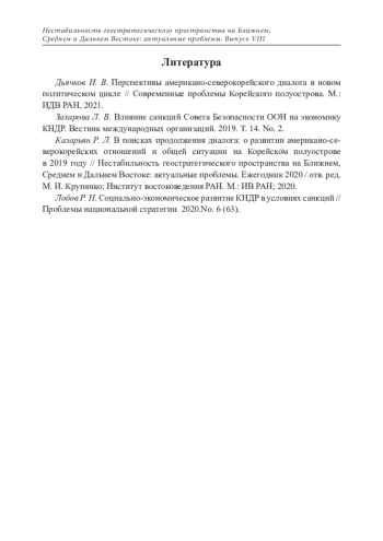 3. Казарьян Р. Л. В поисках продолжения диалога: о развитии американо-северокорейских отношений и общей ситуации на Корейском полуострове в 2019 году // Нестабильность геостратегического пространства на Ближнем, Среднем и Дальнем Востоке: актуальные проблемы. Ежегодник 2020 / отв. ред. М. И. Крупянко; Институт востоковедения РАН. М.: ИВ РАН; 2020.