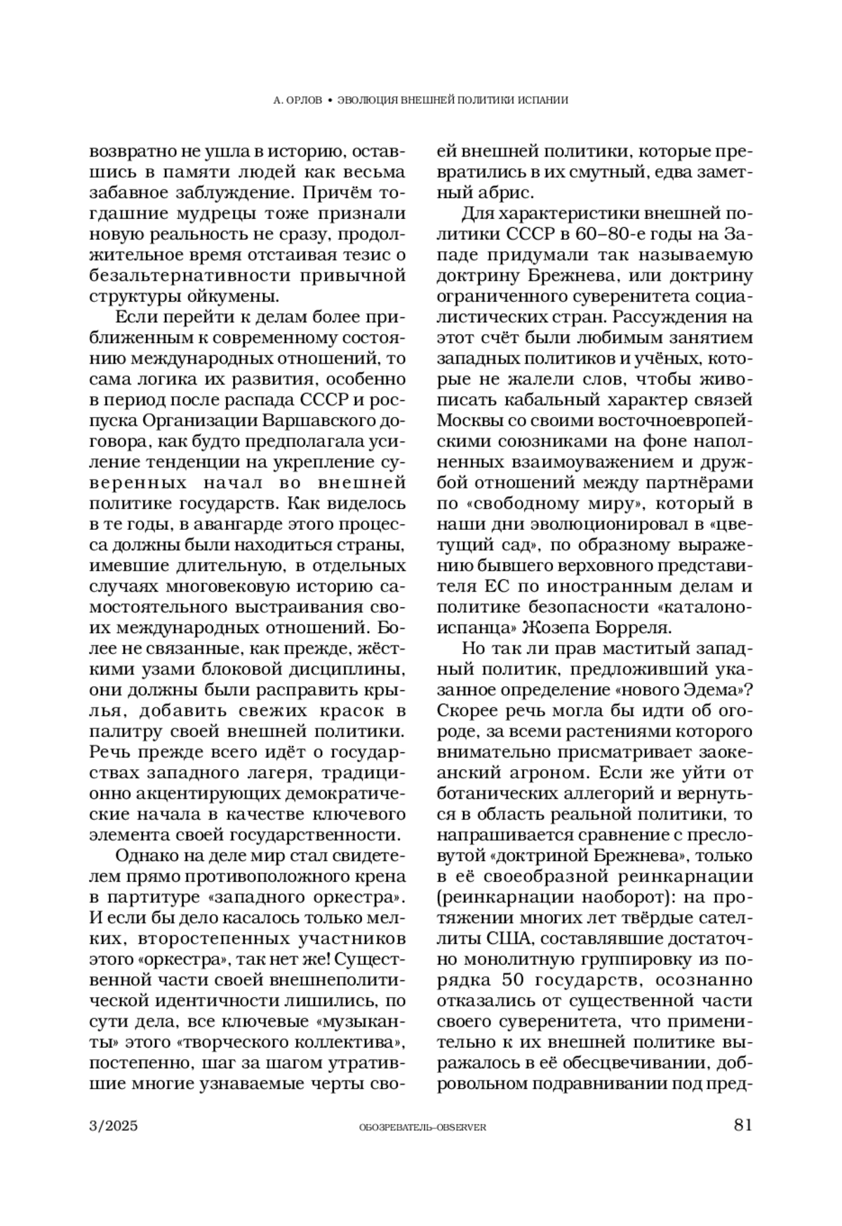 В последние десятилетия Испания, стремясь плыть в фарватере западного, американоцентричного мейнстрима, утратила значительную часть своей внешнеполитической идентичности. Мадрид долгие годы существовал в парадигме однополярного мира, основанного на неких правилах, отвергая концепцию многополярности, на которую ориентируется всё больше государств мира. Это привело к тому, что Испания, в отличие от прежних лет, не имеет собственной позиции по ключевым вопросам мировой политики.