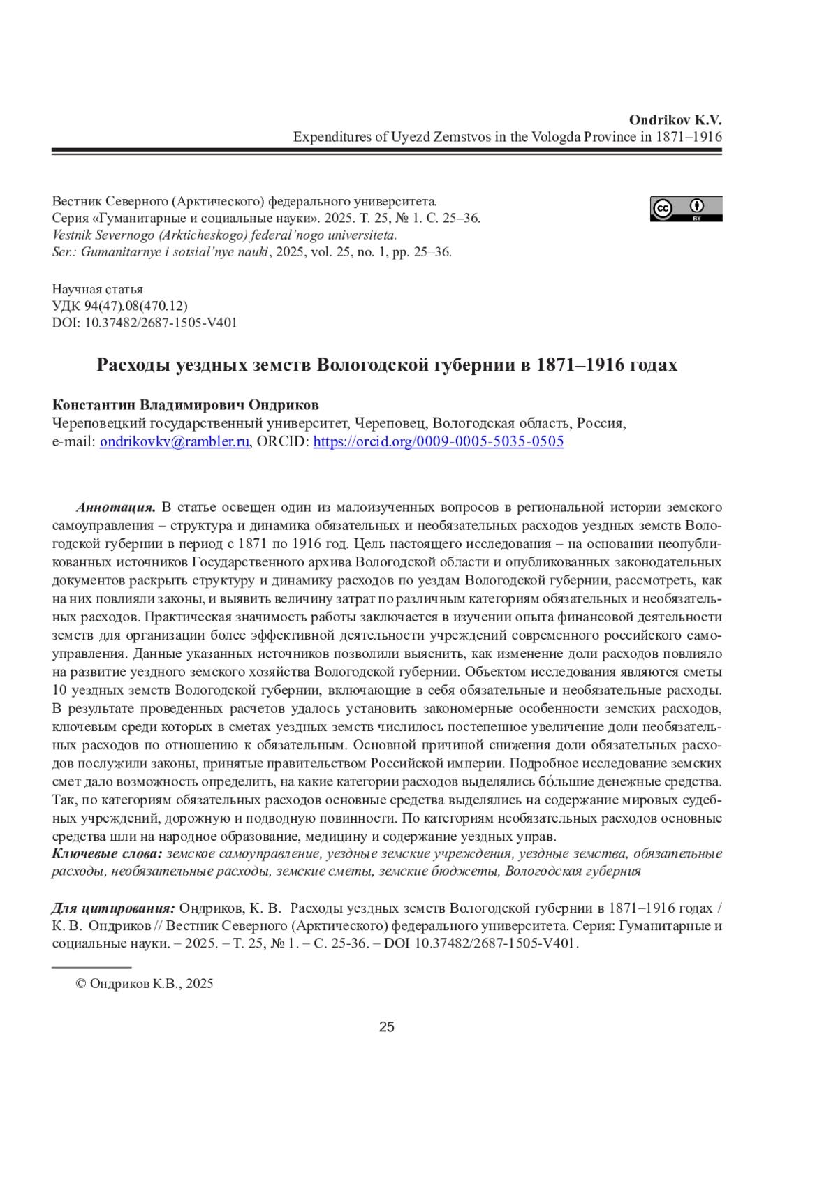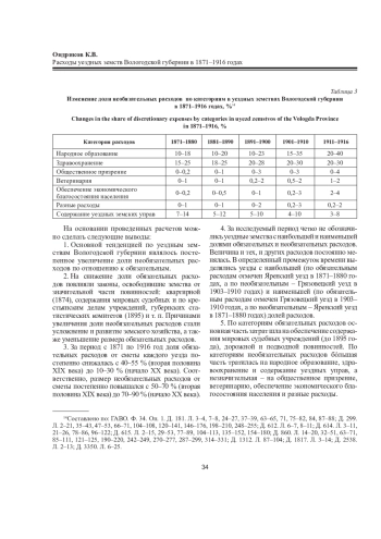 В статье освещен один из малоизученных вопросов в региональной истории земского самоуправления - структура и динамика обязательных и необязательных расходов уездных земств Вологодской губернии в период с 1871 по 1916 год. Цель настоящего исследования - на основании неопубликованных источников Государственного архива Вологодской области и опубликованных законодательных документов раскрыть структуру и динамику расходов по уездам Вологодской губернии, рассмотреть, как на них повлияли законы, и выявить величину затрат по различным категориям обязательных и необязательных расходов. Практическая значимость работы заключается в изучении опыта финансовой деятельности земств для организации более эффективной деятельности учреждений современного российского самоуправления. Данные указанных источников позволили выяснить, как изменение доли расходов повлияло на развитие уездного земского хозяйства Вологодской губернии. Объектом исследования являются сметы 10 уездных земств Вологодской губернии, включающие в себя обязательные и необязательные расходы. В результате проведенных расчетов удалось установить закономерные особенности земских расходов, ключевым среди которых в сметах уездных земств числилось постепенное увеличение доли необязательных расходов по отношению к обязательным. Основной причиной снижения доли обязательных расходов послужили законы, принятые правительством Российской империи. Подробное исследование земских смет дало возможность определить, на какие категории расходов выделялись большие денежные средства. Так, по категориям обязательных расходов основные средства выделялись на содержание мировых судебных учреждений, дорожную и подводную повинности. По категориям необязательных расходов основные средства шли на народное образование, медицину и содержание уездных управ.
