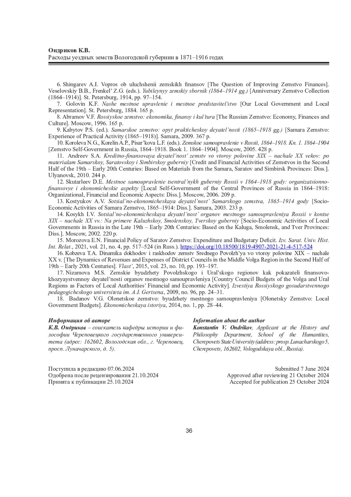 15. Морозова Е.Н. Финансовая политика Саратовского земства: расходы и бюджетный дефицит // Изв. Саратов. ун-та. Новая сер. Сер.: История. Междунар. отношения. 2021. Т. 21, вып. 4. С. 517-524. DOI: 10.18500/1819-4907-2021-21-4-517-524 EDN: HAGTKV
