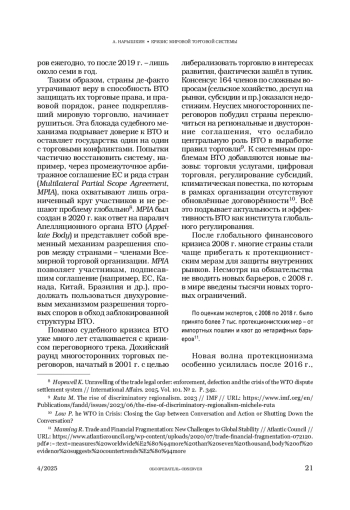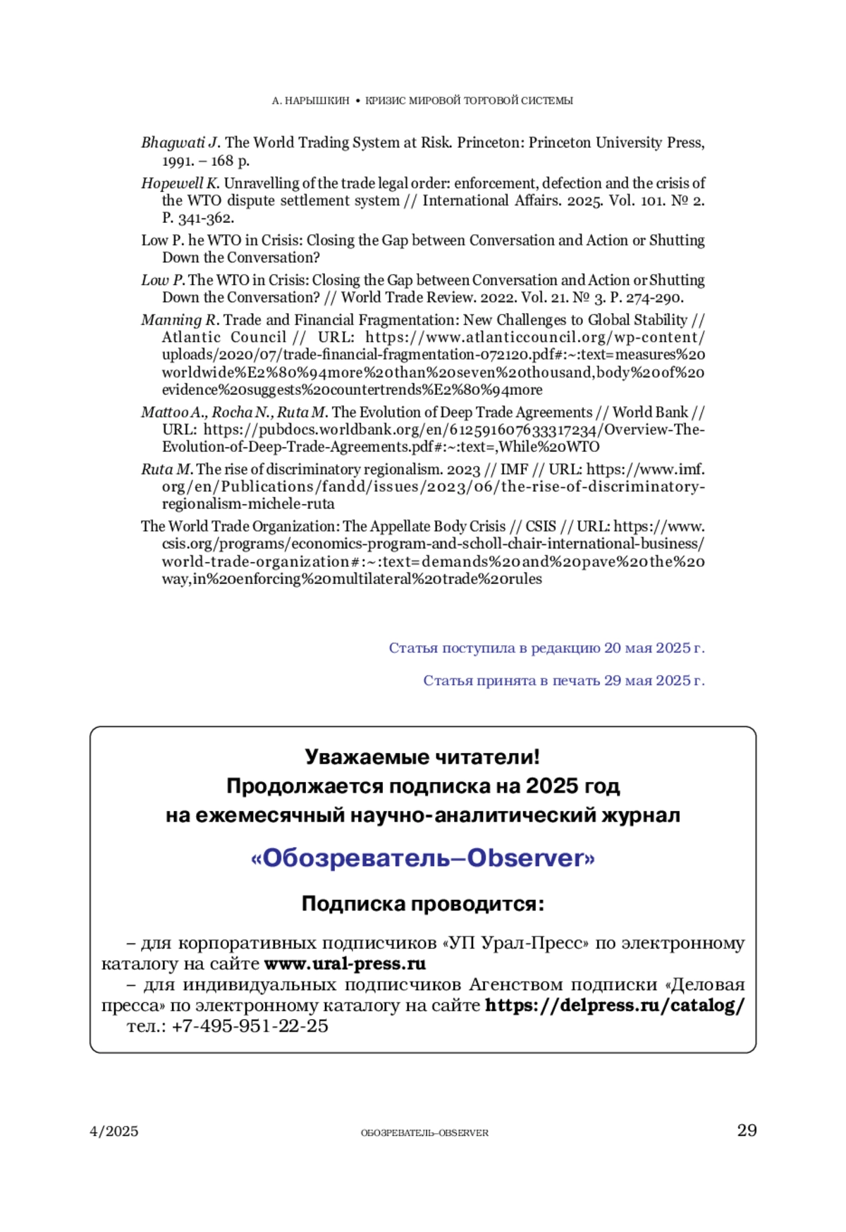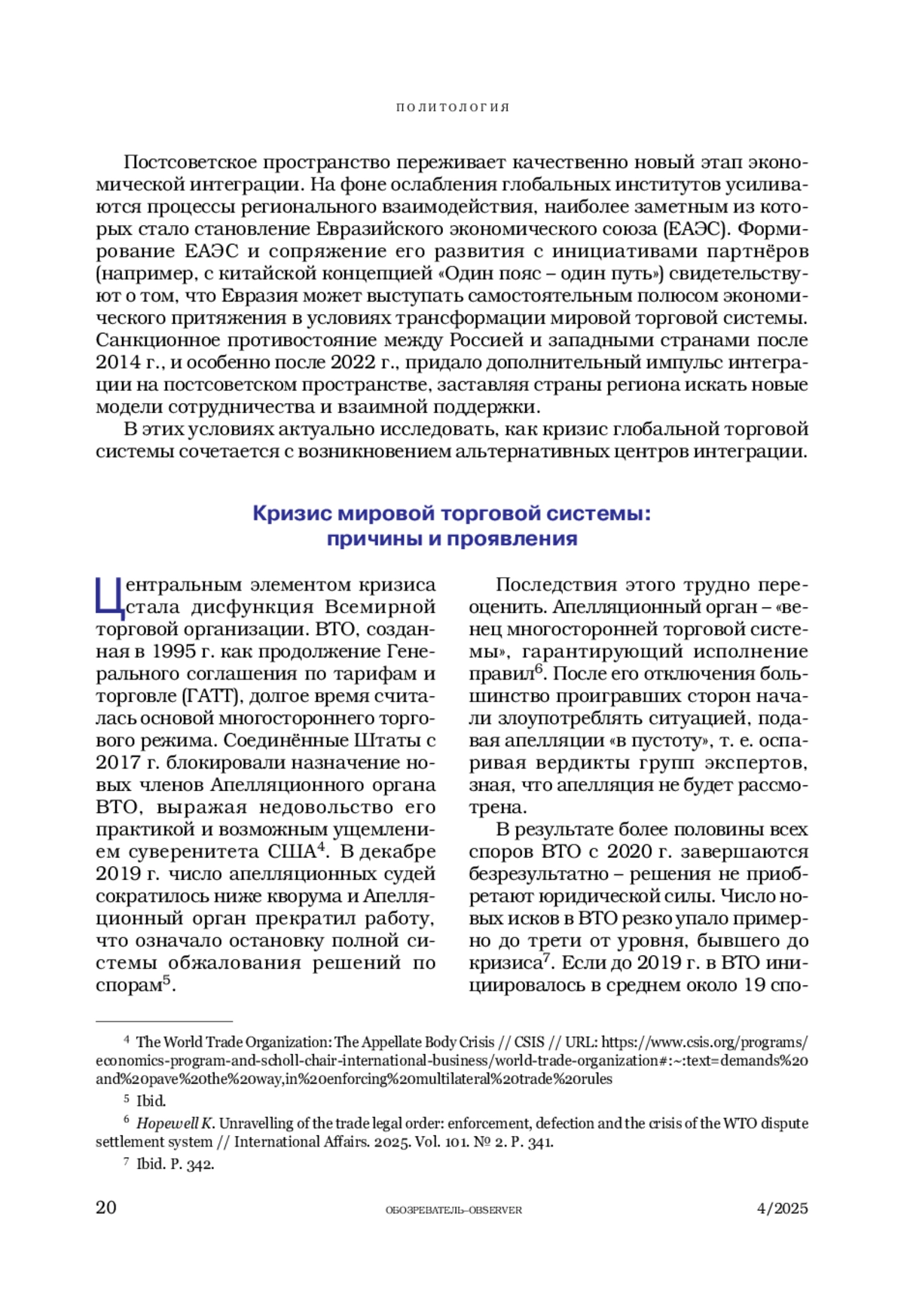 7. Hopewell K. Unravelling of the trade legal order: enforcement, defection and the crisis of the WTO dispute settlement system // International Affairs. 2025. Vol. 101. № 2. Р. 341-362.