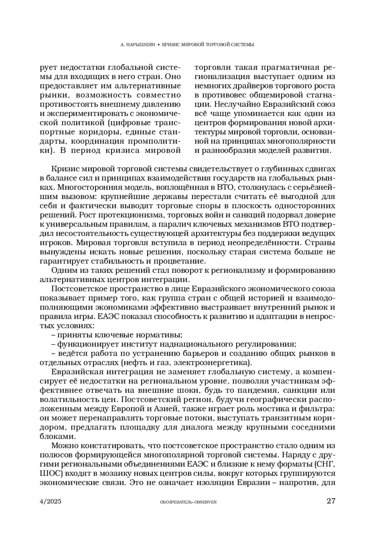 В статье рассматривается современный кризис глобальной торго вой системы и роль постсоветского пространства как альтернатив ного полюса политико-экономического притяжения. Анализируются причины кризиса, включая блокировку механизмов ВТО, усиление протекционизма и фрагментации мировой экономики.