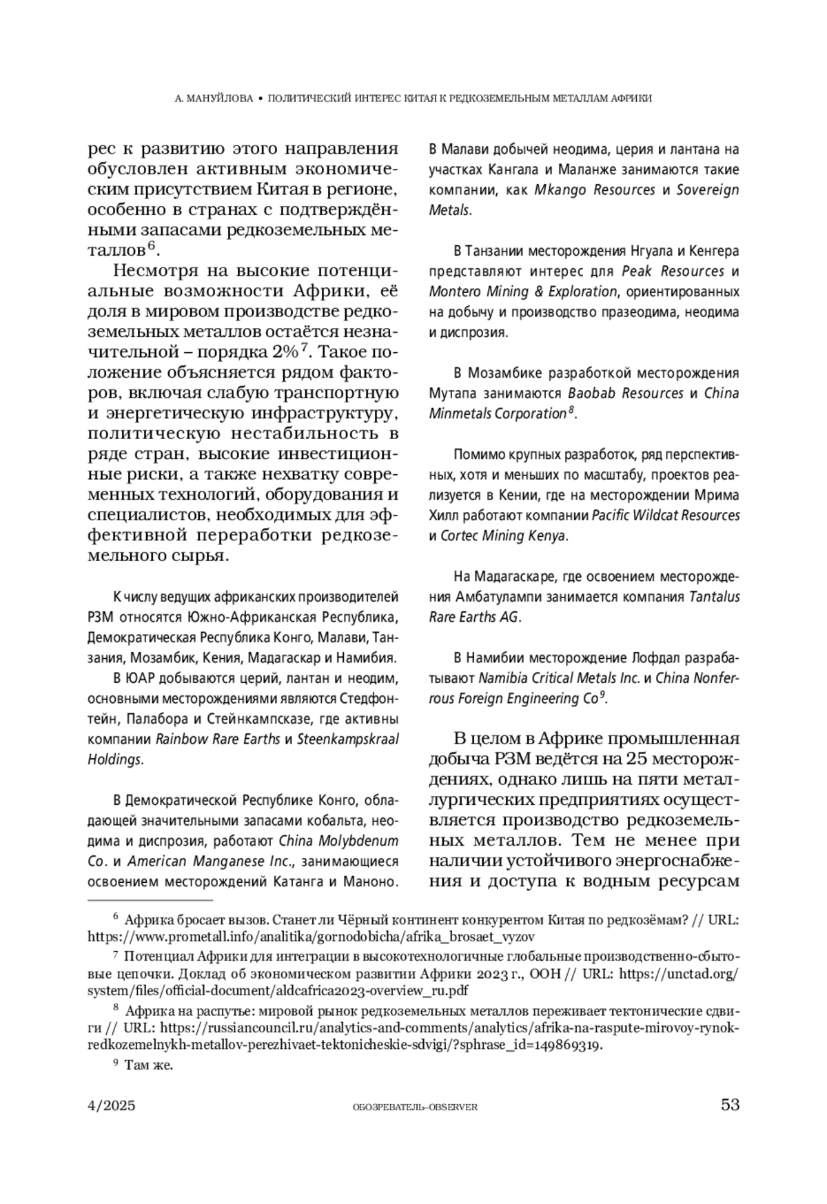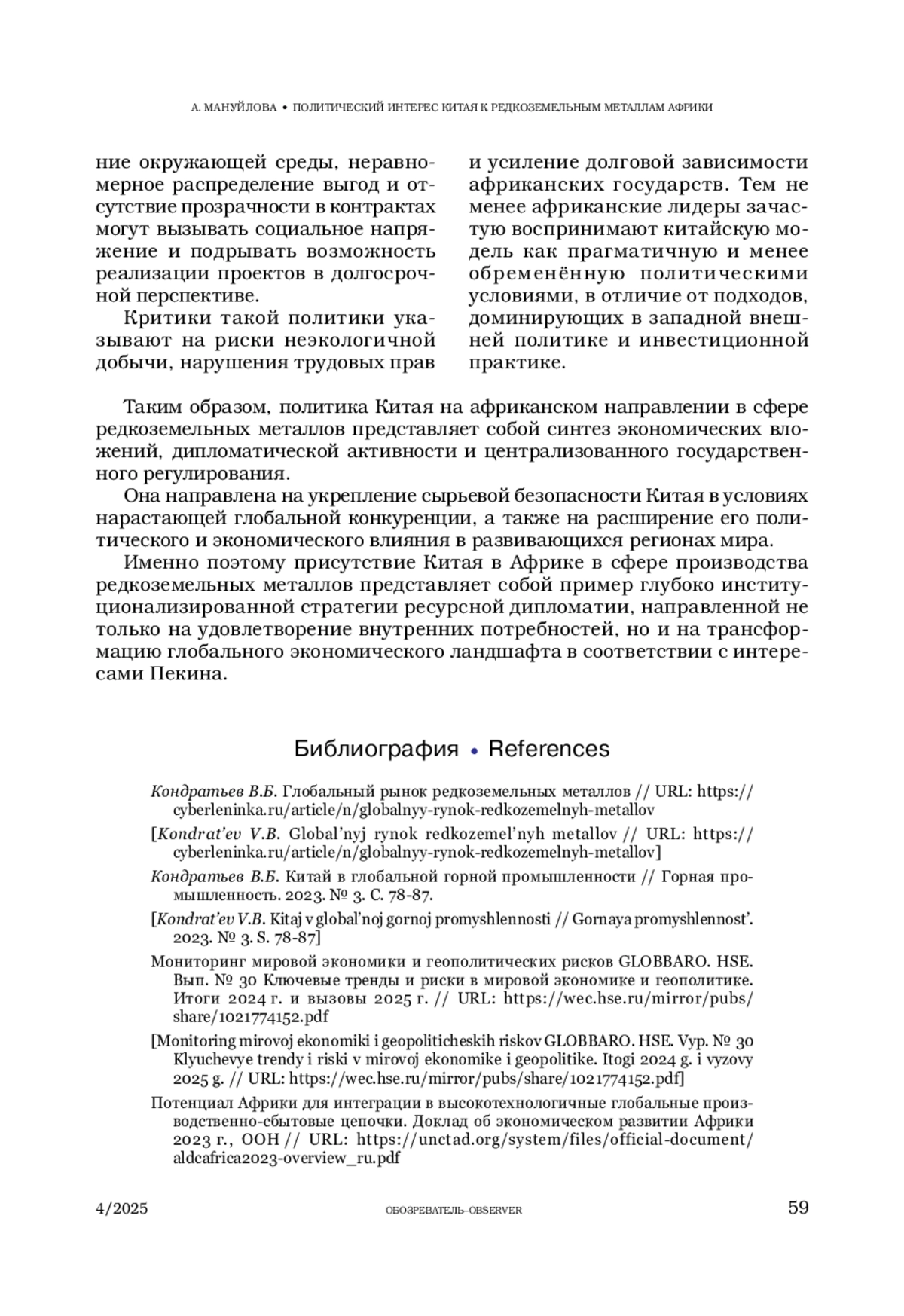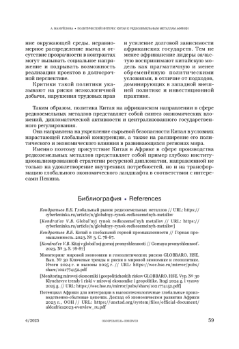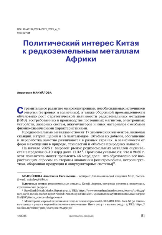 МАНУЙЛОВА А. Е. ПОЛИТИЧЕСКИЙ ИНТЕРЕС КИТАЯ К РЕДКОЗЕМЕЛЬНЫМ МЕТАЛЛАМ АФРИКИ? // ОБОЗРЕВАТЕЛЬ. 2025. № 4
