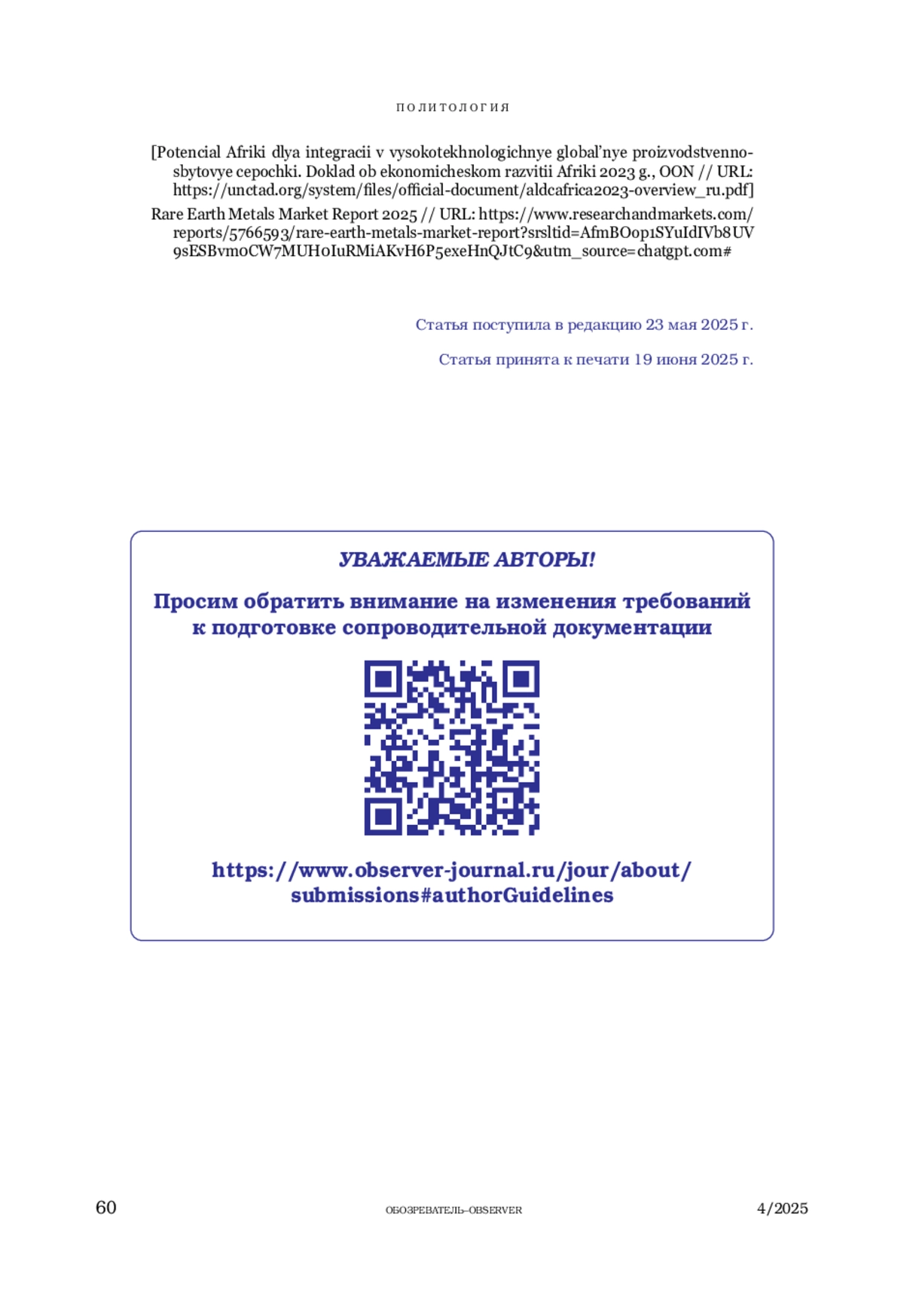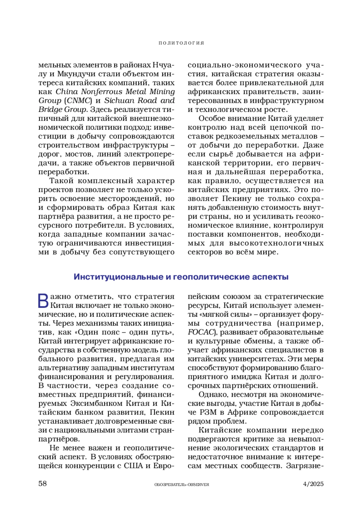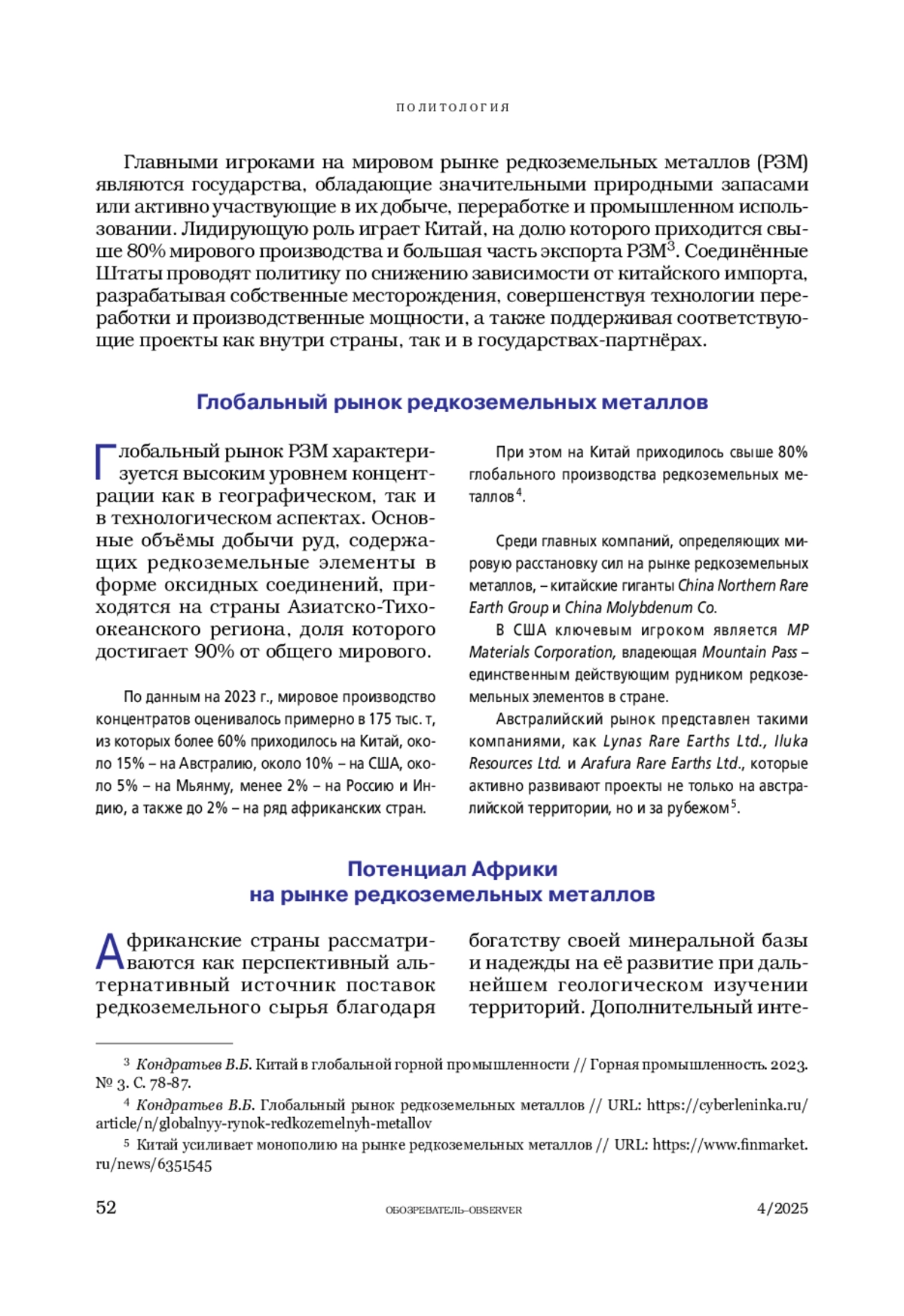 МАНУЙЛОВА А. Е. ПОЛИТИЧЕСКИЙ ИНТЕРЕС КИТАЯ К РЕДКОЗЕМЕЛЬНЫМ МЕТАЛЛАМ АФРИКИ? // ОБОЗРЕВАТЕЛЬ. 2025. № 4