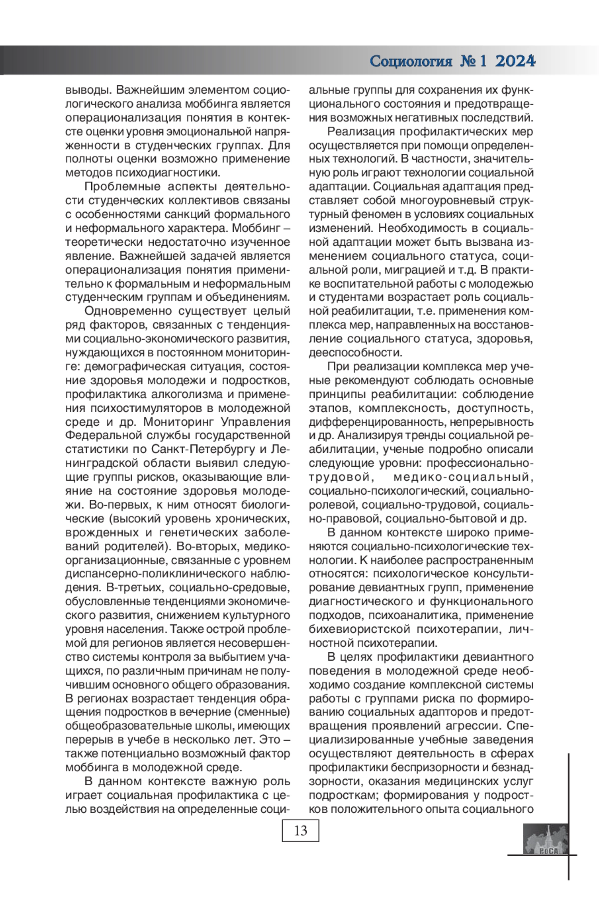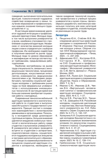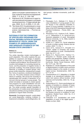 ОЗДОЕВА Л. А. ОБОСНОВАНИЕ ФОРМИРОВАНИЯ СПЕЦИАЛИЗИРОВАННЫХ ПРОГРАММ СОЦИАЛЬНОЙ РЕАБИЛИТАЦИИ ДЕВИАНТНОГО ПОВЕДЕНИЯ МОЛОДЕЖИ: НА ПРИМЕРЕ СТУДЕНТОВ И АСПИРАНТОВ ИНГУШСКОГО ГОСУДАРСТВЕННОГО УНИВЕРСИТЕТА // СОЦИОЛОГИЯ. 2024. № 1